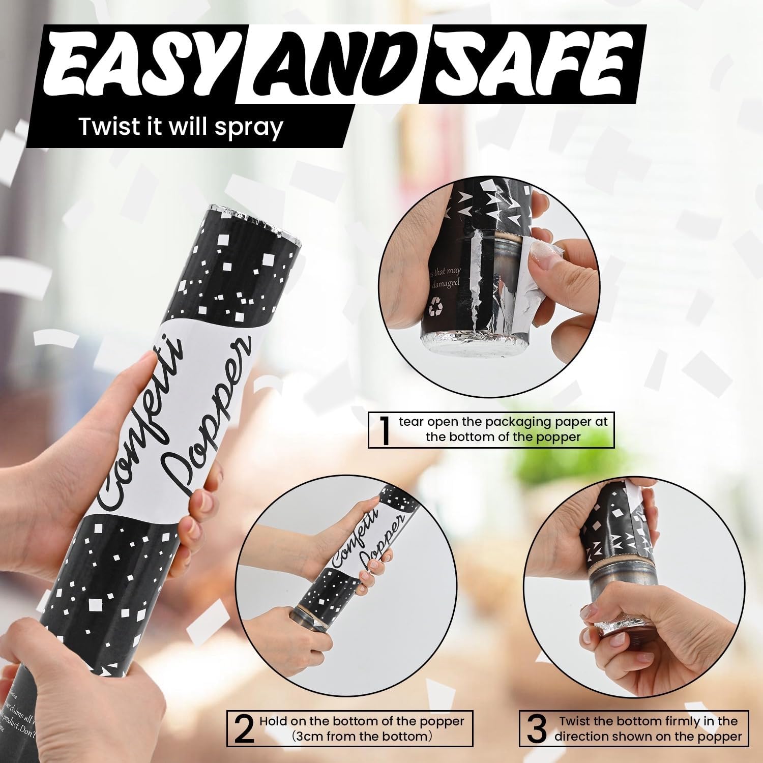 • 【Safe and Fun White Confetti Poppers】 Enjoy popping our White confetti poppers, made with safe, non-toxic materials. Our high-quality confetti cannons are safe for indoor and outdoor use, ensuring a wonderful and worry-free party experience for you and your guests.