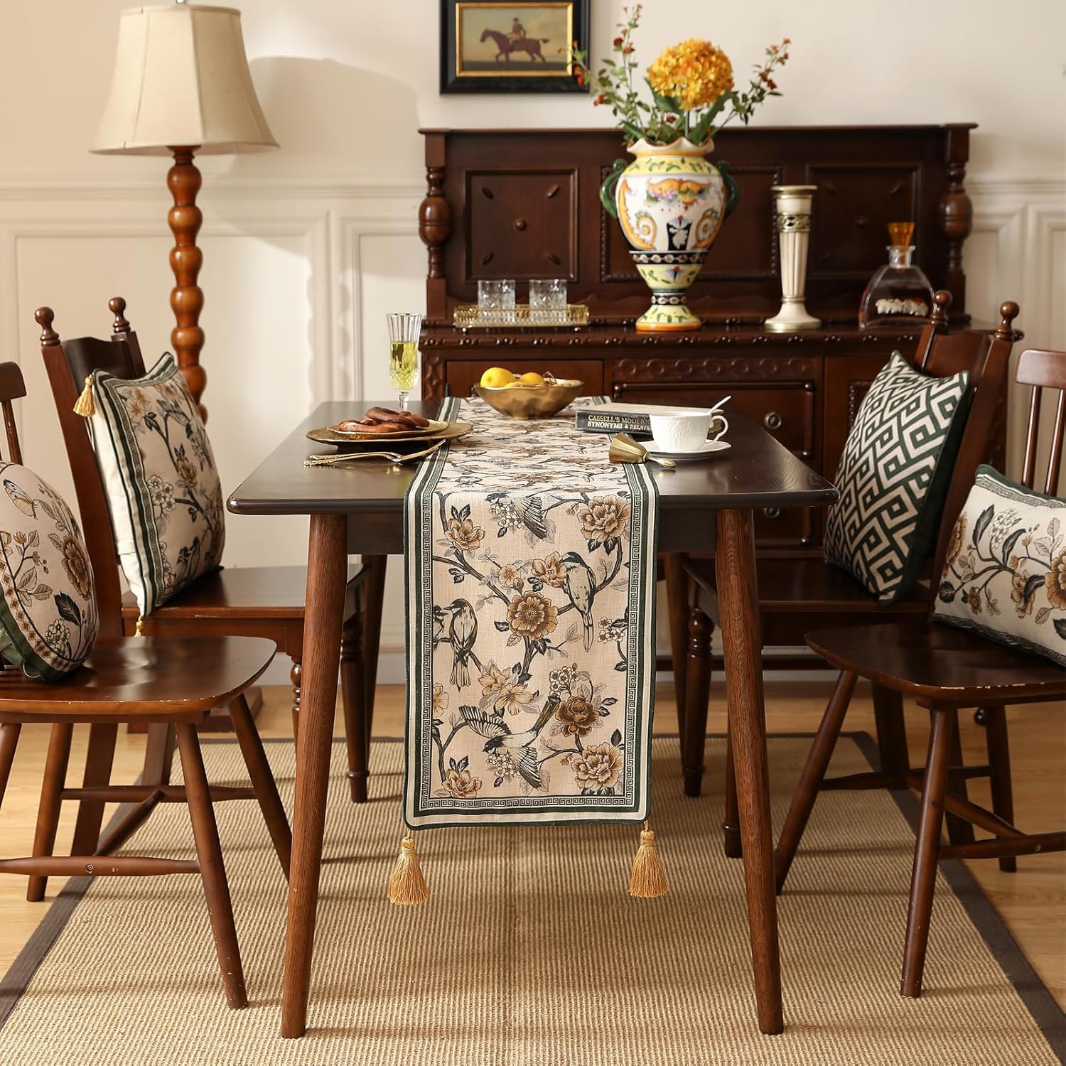 ISAENNE Designer Vintage Beige Linen Table Runner 118 Inches Extra Long,Elegant Floral and Bird Pattern Decor Table Runners for Dining Tables,Thanksgiving,Christmas,Banquet,Party,12"*118"-Murad A