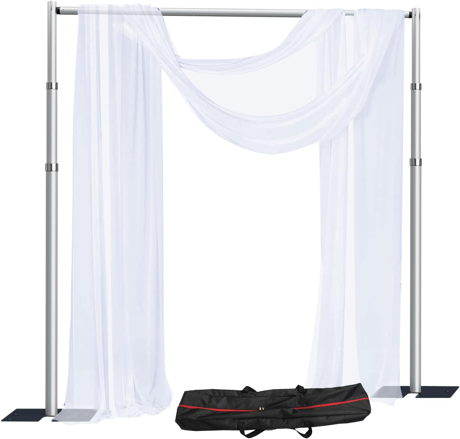 • The Kit included 2 x Heavy Metal Base, 2 x Support uprights, 1 x Adjustable Cross Bar, 2 x short straight pipes, 2 x Screw,1 x Wrench 1 x Carry bag. Pipe and drape backdrop kit is Aluminum Stand, Durable, easy to assemble and take down.