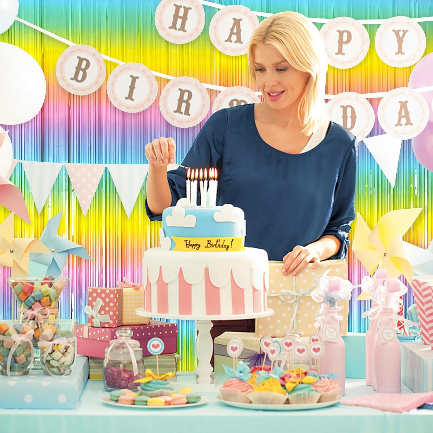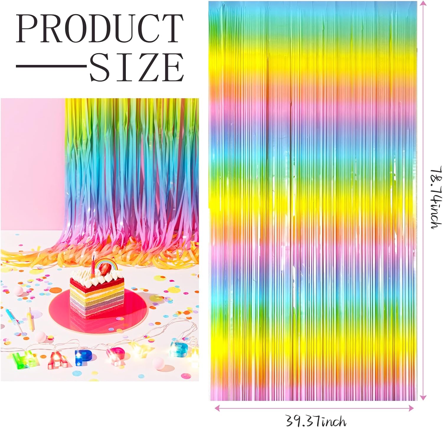 • Rainbow Birthday Decorations:3 packs rainbow streamers, the size of the foil curtain is 3.28 ft x 6.56 ft.It's long enough to fit any occasion. Please do not stick the foil curtain on uneven or stained walls to prevent it from falling off.