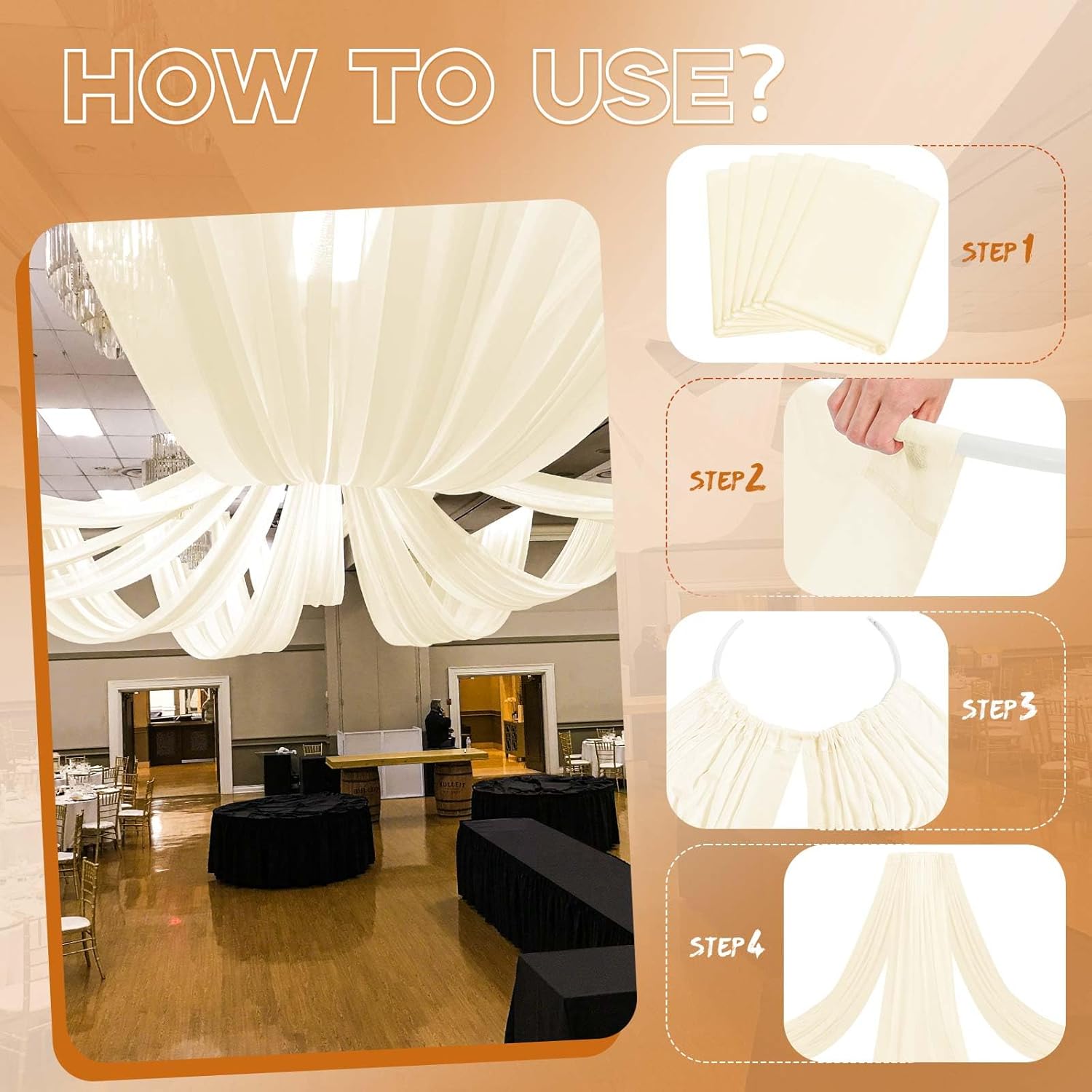 • 👑【Premium Ceiling Drapes Fabric】This wedding ceiling backdrop is made from premium cheesecloth material that is soft to the touch, breathable and lightweight. Easy draping or hanging straight, good vertical sense and durable. Paired with romantic cheese cloth fabric, you can easily create a romantic event atmosphere.