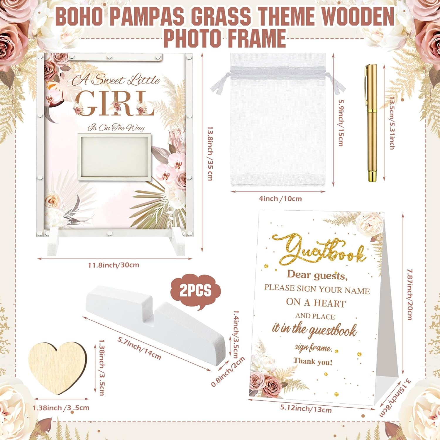 • Floral Baby Shower Decorations: you will receive a boho pampas grass theme baby shower guest book with photo frame in 11.81 x 13.78 inches/ 30 x 35 cm, 1 pen, 60 heart wood cutouts, 1 organza bag, 2 display shelves, enough to meet the needs of your floral themed baby shower party