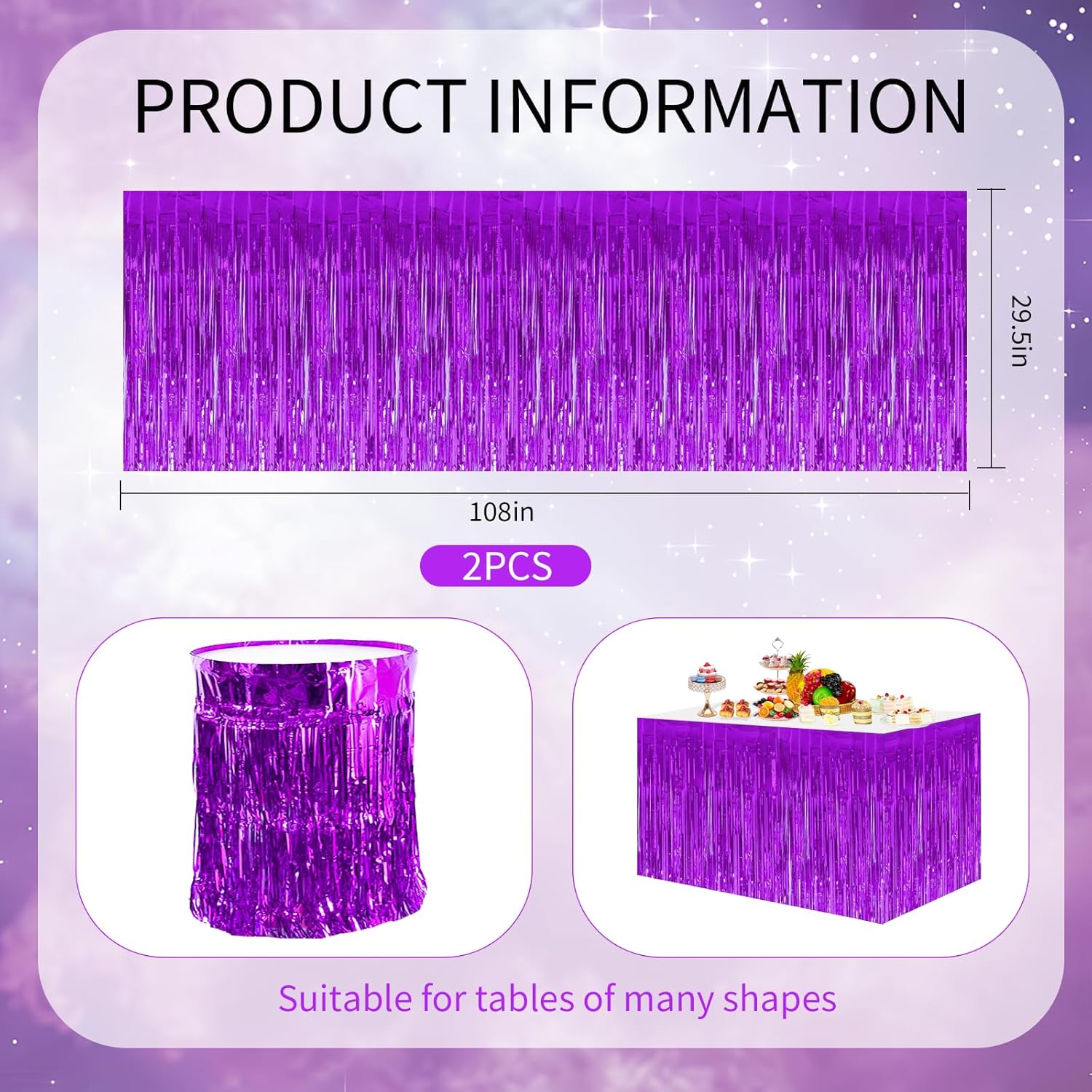 • 【Package includes】2 Packs of metallic foil tassel table skirts, size (width x drop): 108 x 29.5 inches, which is enough to decorate your party, provide you with excellent decoration effect and light up the party atmosphere