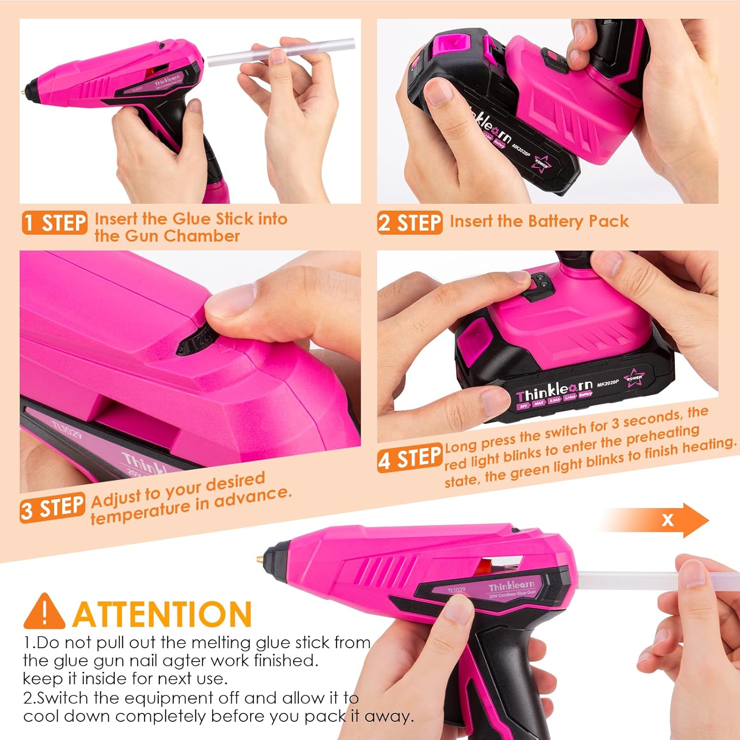 • Temp Adjust - THINKLEARN Pink 20V Heavy Duty Glue Gun can be preset for temperature.The variable temperature range of it is from 130℃ to 220℃, allows you to set the desired temperature for process projects with different materials.