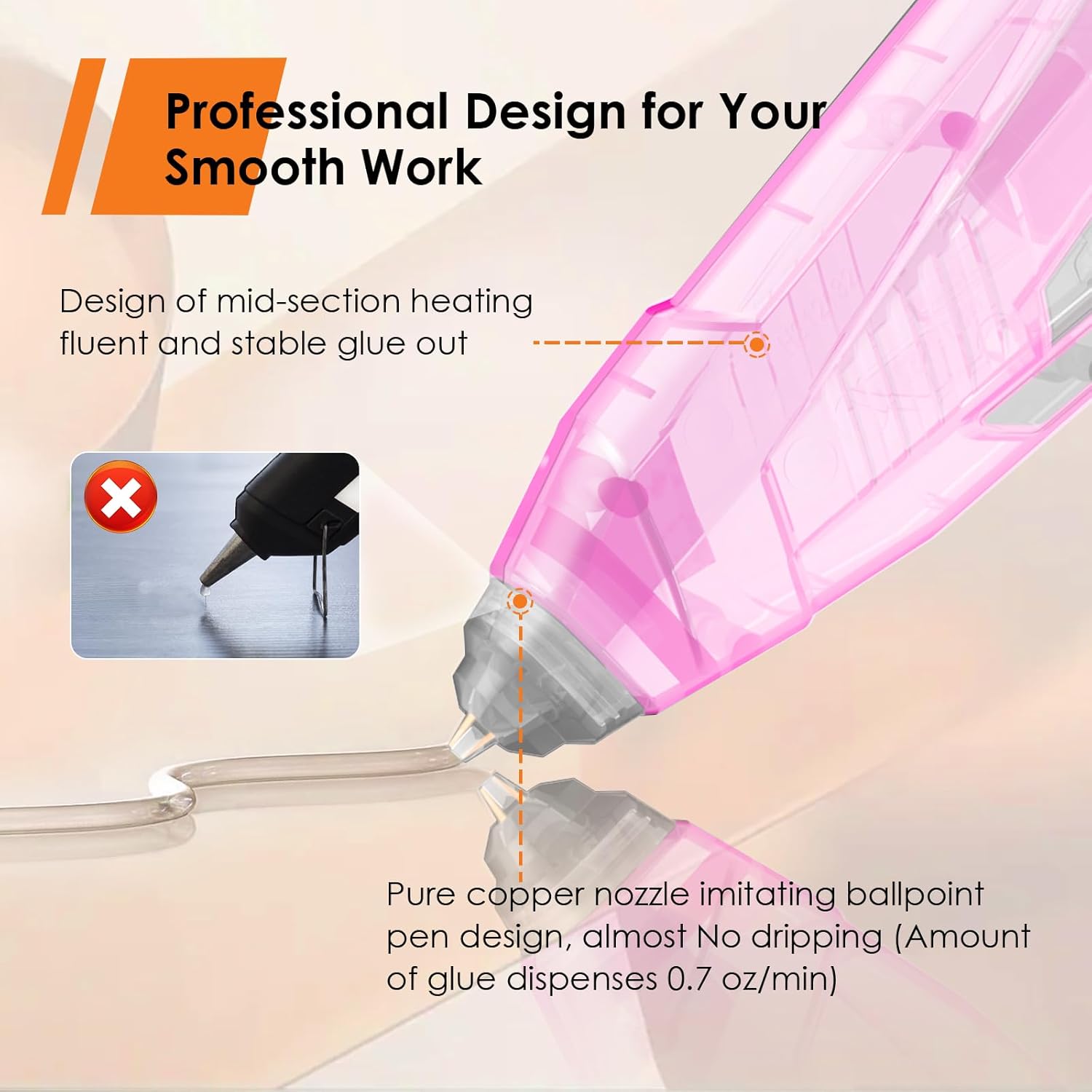 • Anti-drip Design - Refuse to leak glue! The copper and insulating nozzles are designed to prevent glue leaks and save more glue sticks. The pink drip-proof PVC table mat in the set keeps your workshop clean all the time.