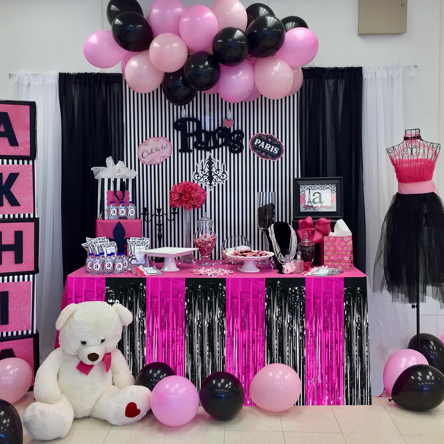 BEISHIDA 2 Pack Hot Pink Black Table Skirts Party Decorations Purple Metallic Tinsel Foil Fringe Table Skirts for Mouse Theme Birthday Mean Girls Hot Girls Wednesday Party