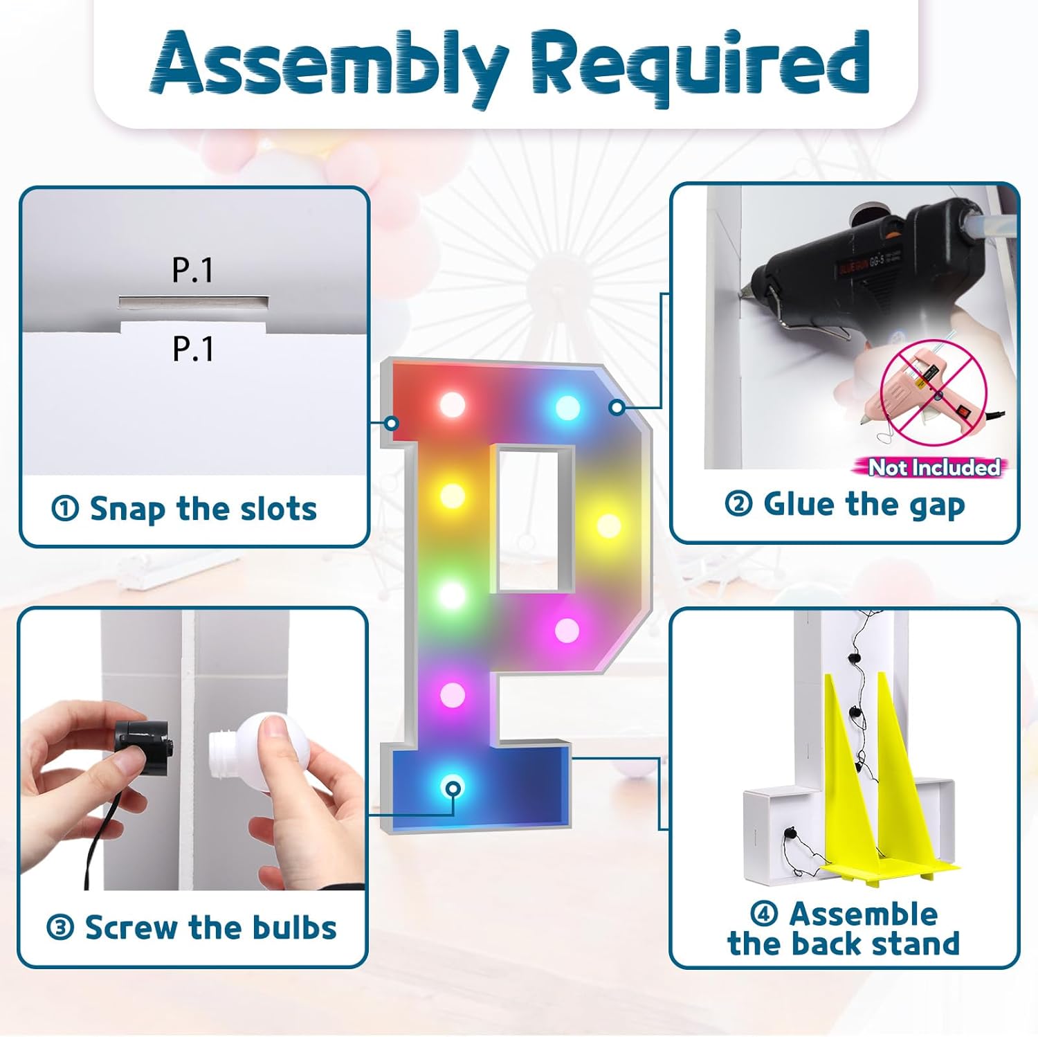 • Assembly Required. To assemble the light up numbers and letters, a hot glue gun is necessary. We have conveniently pre-cut the numbers into several pieces for your convenience. Simply consult the included instruction manual to easily assemble the impressive 4 ft tall and 3ft tall marquee numbers and letters using a hot glue gun.