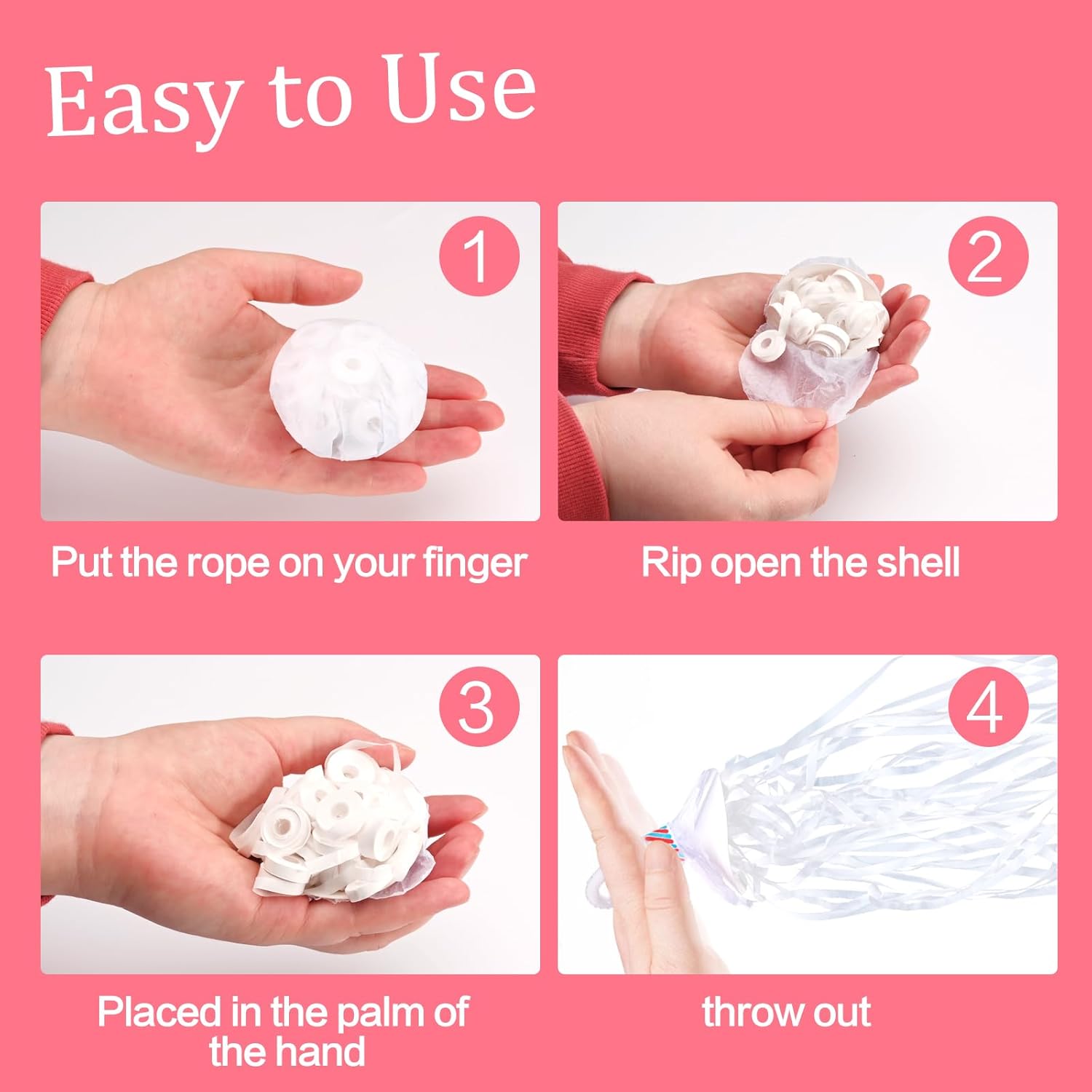 • How to use - Put the looped handle above the ribbons on your finger, then tear the wrapping paper at the bottom and throw them at a forward and upward angle, the more ribbons you throw at the same time the better the result. You can achieve a shocking effect and an instant lift in atmosphere