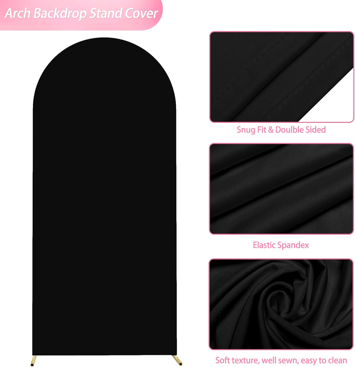 • 【Arch Backdrop Stand and Covers Package】Package contains 1pcs wedding arch stand and 1pcs arch cover. Size: 6x2.6ft(HxW). Material: metal arch backdrop stand and spandex arch cover. Color: Black arch cover and gold wedding arch stand. Decorate your party with our gold arch stand and arch covers to create an epic decor for your celebration.