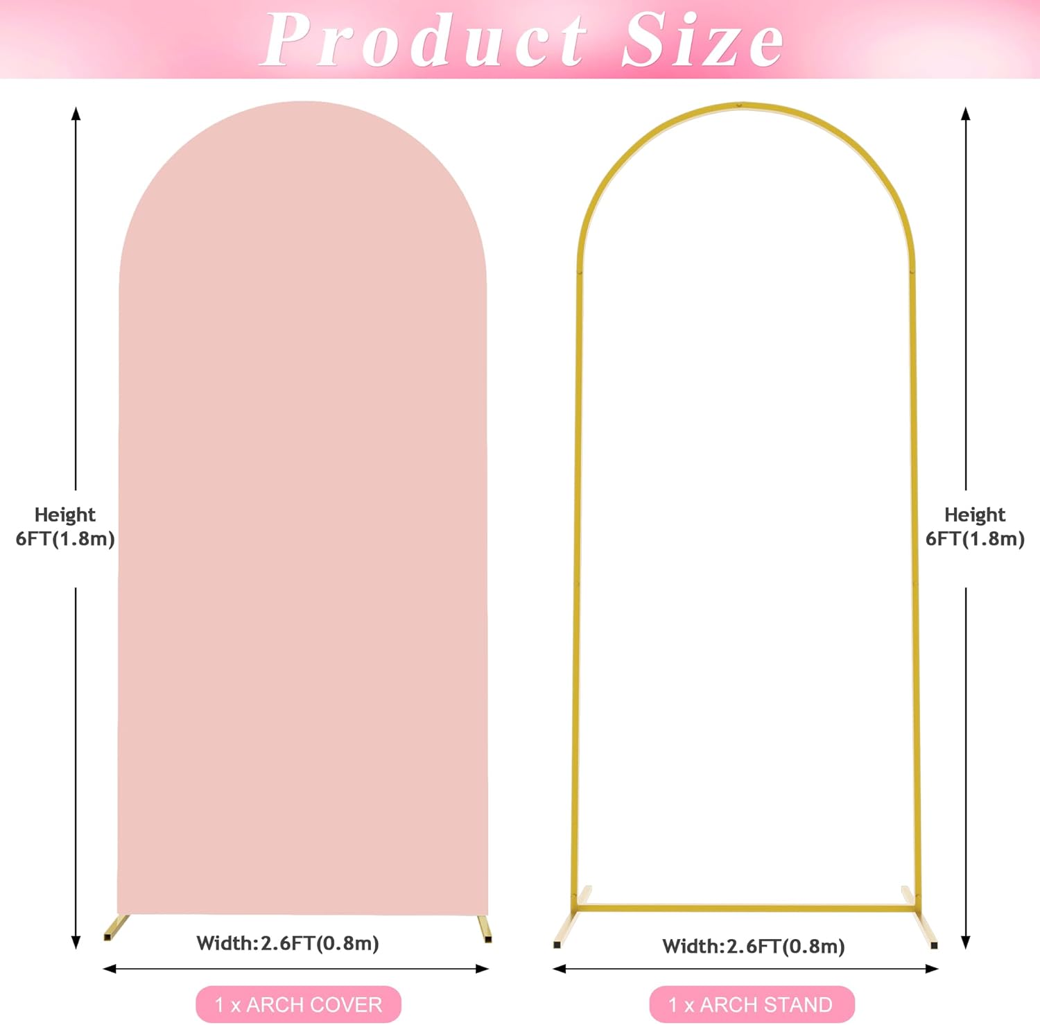 • 【Arch Stand and Covers Package】Package contains 1pcs wedding arch stand and 1pcs arch cover. Size: 6x2.6ft(HxW). Material: metal arch backdrop stand and spandex arch cover. Color: Pale Pink arch cover and gold wedding arch stand. Decorate your party with our gold arch stand and arch covers to create an epic decor for your celebration.