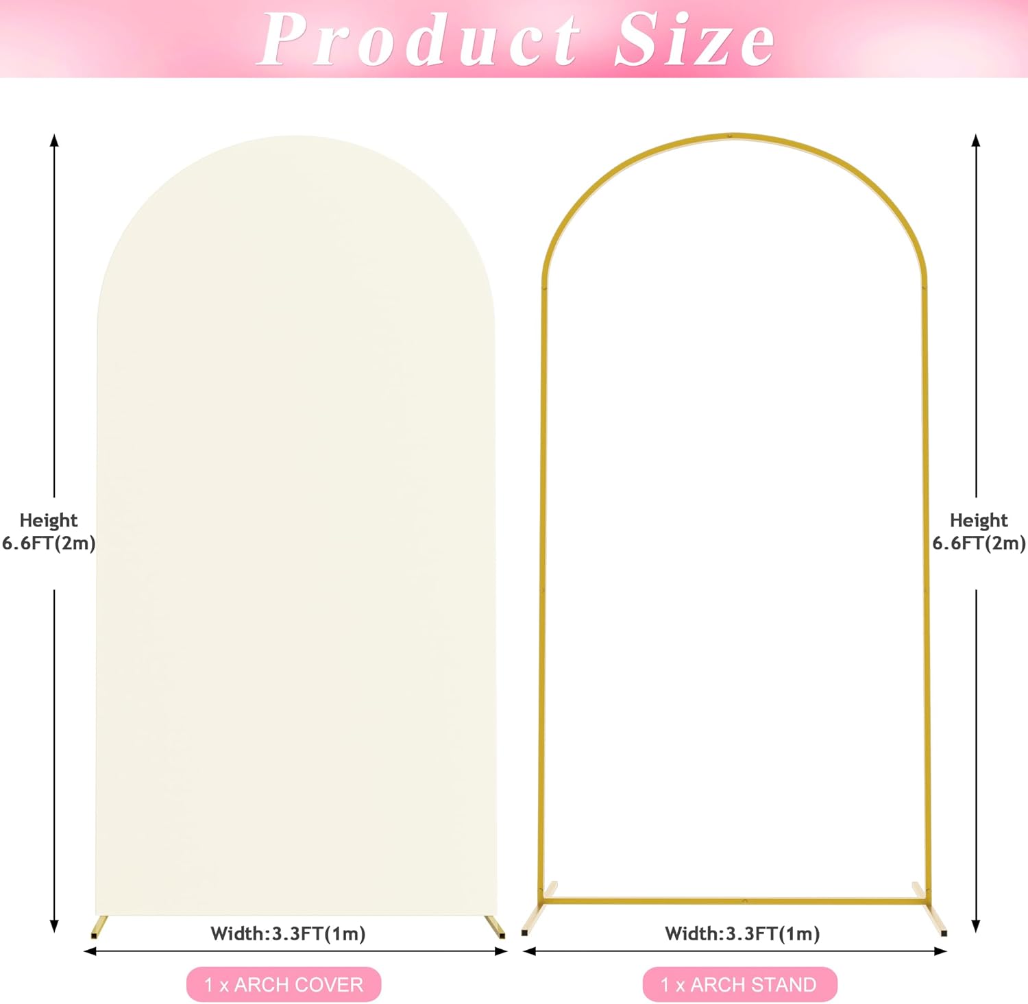 • 【Arch Stand and Covers Package】Package contains 1pcs wedding arch stand and 1pcs arch cover. Size: 6.6x3.3ft(HxW). Material: metal arch backdrop stand and spandex arch cover. Color: Ivory arch cover and gold wedding arch stand. Decorate your party with our gold arch stand and arch covers to create an epic decor for your celebration.