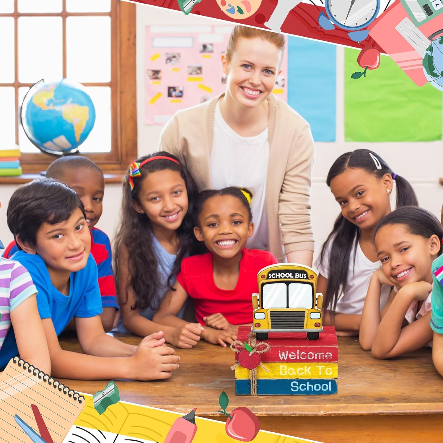 4 Pcs Back to School Table Decorations First Day of School Tiered Tray Decorations Decorative Mini Wooden Books Subject Signs for Office Shelf Classroom Tabletop Bookshelf(Bus)