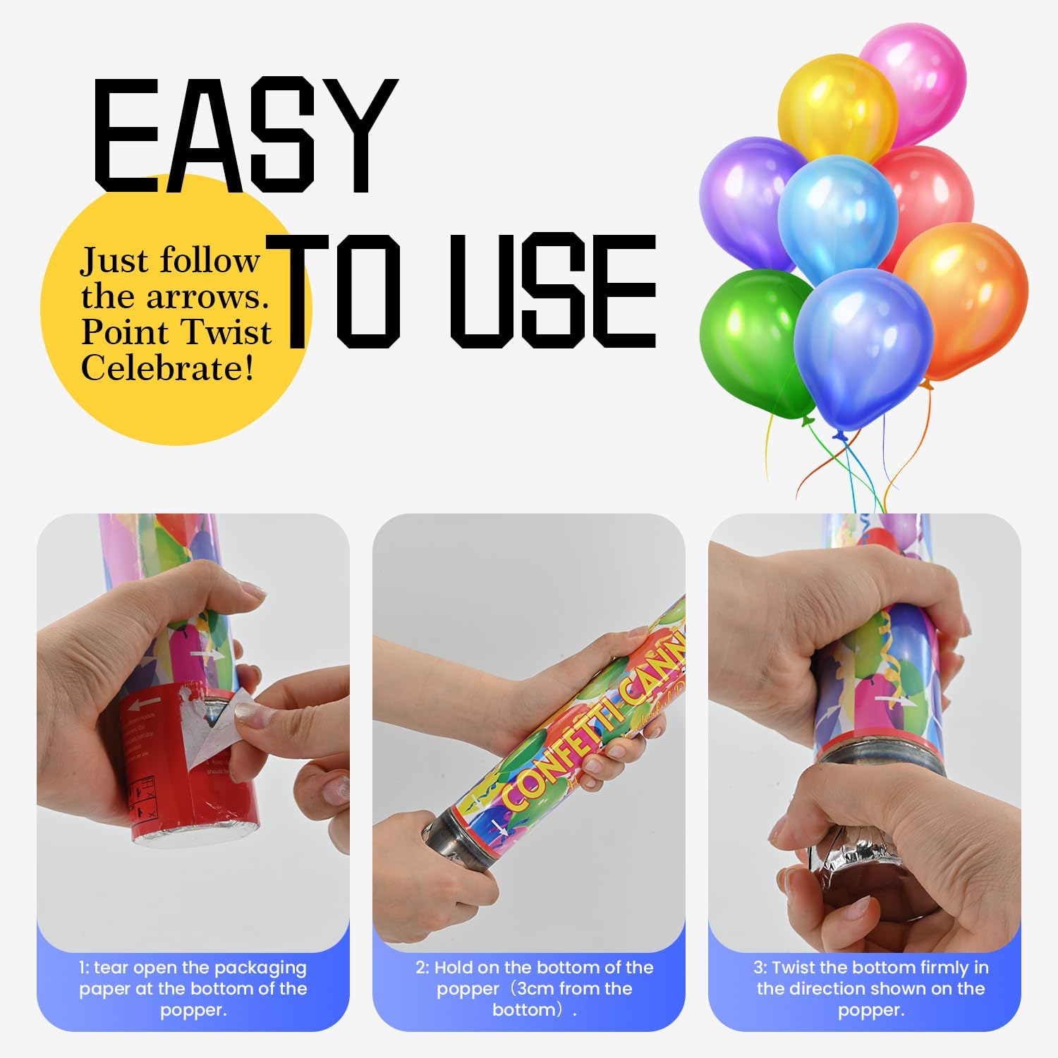 • How To Use Confetti Poppers - Find confetti cannon hard to twist to pop?Maybe you got a wrong way to use confetti poppers. To avoid awkward silence in the beginning, please read the instructions and tear open the packaging paper at the bottom of the popper, then easy to twist it!