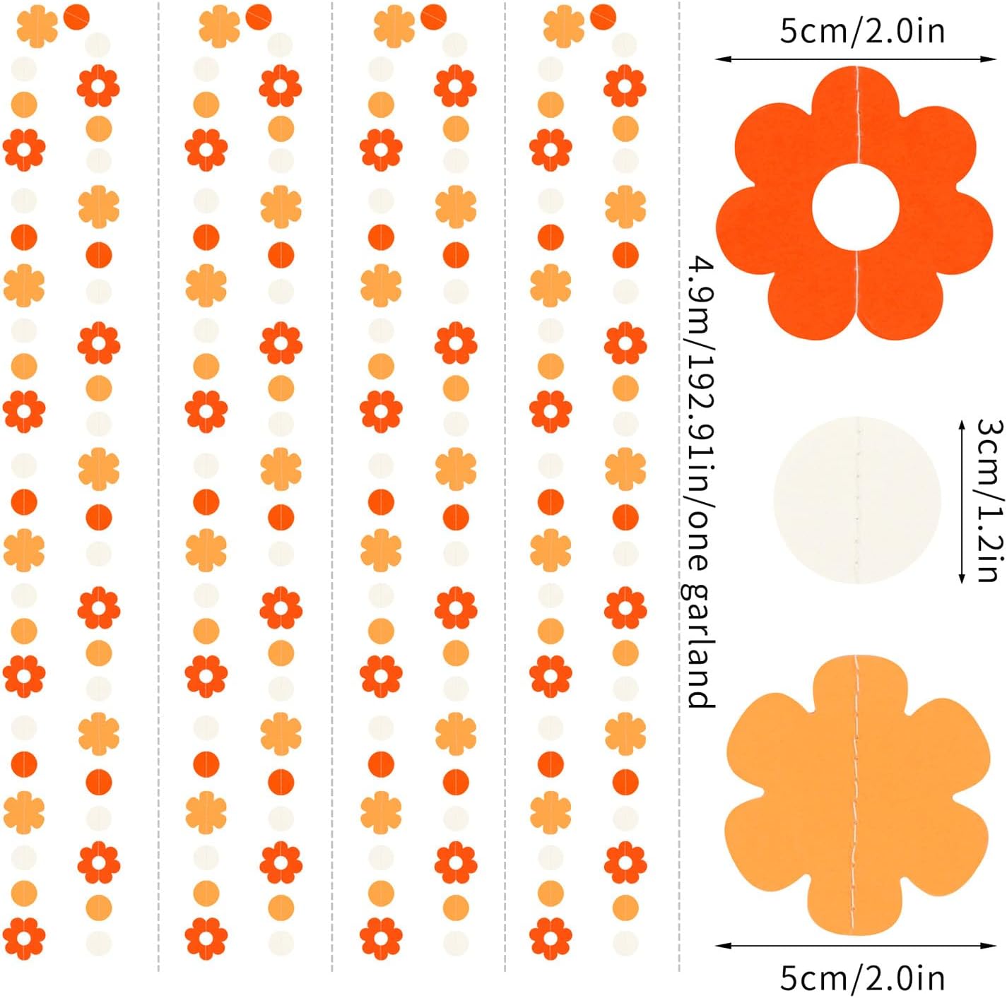 • 【Package Contains】4 sets of the party banner garland,each is 16 feet/ 4.9 meters long, total length is 64 feet/ 19.4 meters.Every Banner has 30pcs dots and 15pcs flower,the size is 1.18” and 1.97”.