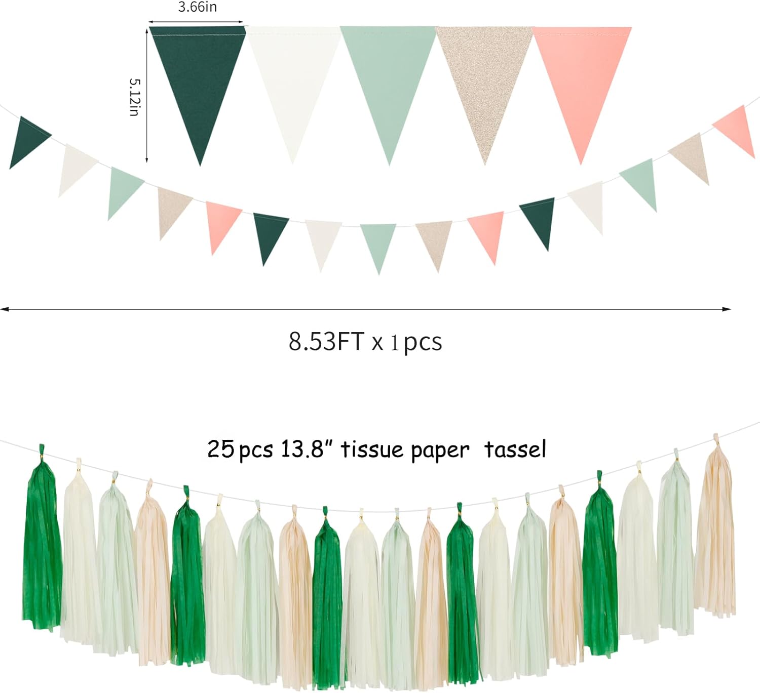 • 【Package Contains】The olive sage green beige champagne gold ivory party kits include 6pcs tissue paper flowers: 3pcs 8" and 3pcs 10" in three color, 1pcs Triangle Flags,1pcs circle dots paper garland,15pcs tassel garland. Total 23pcs.
