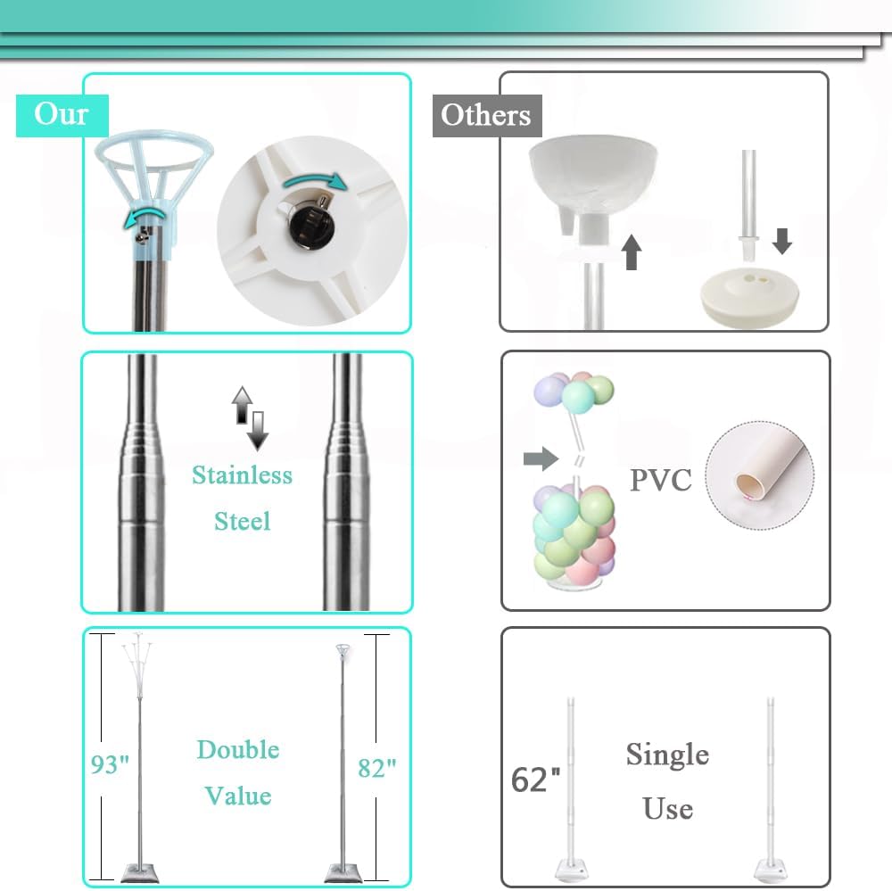 • Adjustable Height: The Decojoy 2IN1 Balloon Arch Kit includes two height-adjustable 7 ft balloon column kits or two 9 ft 7 stick balloon tree stand kits, allowing you to customize the height for your party.