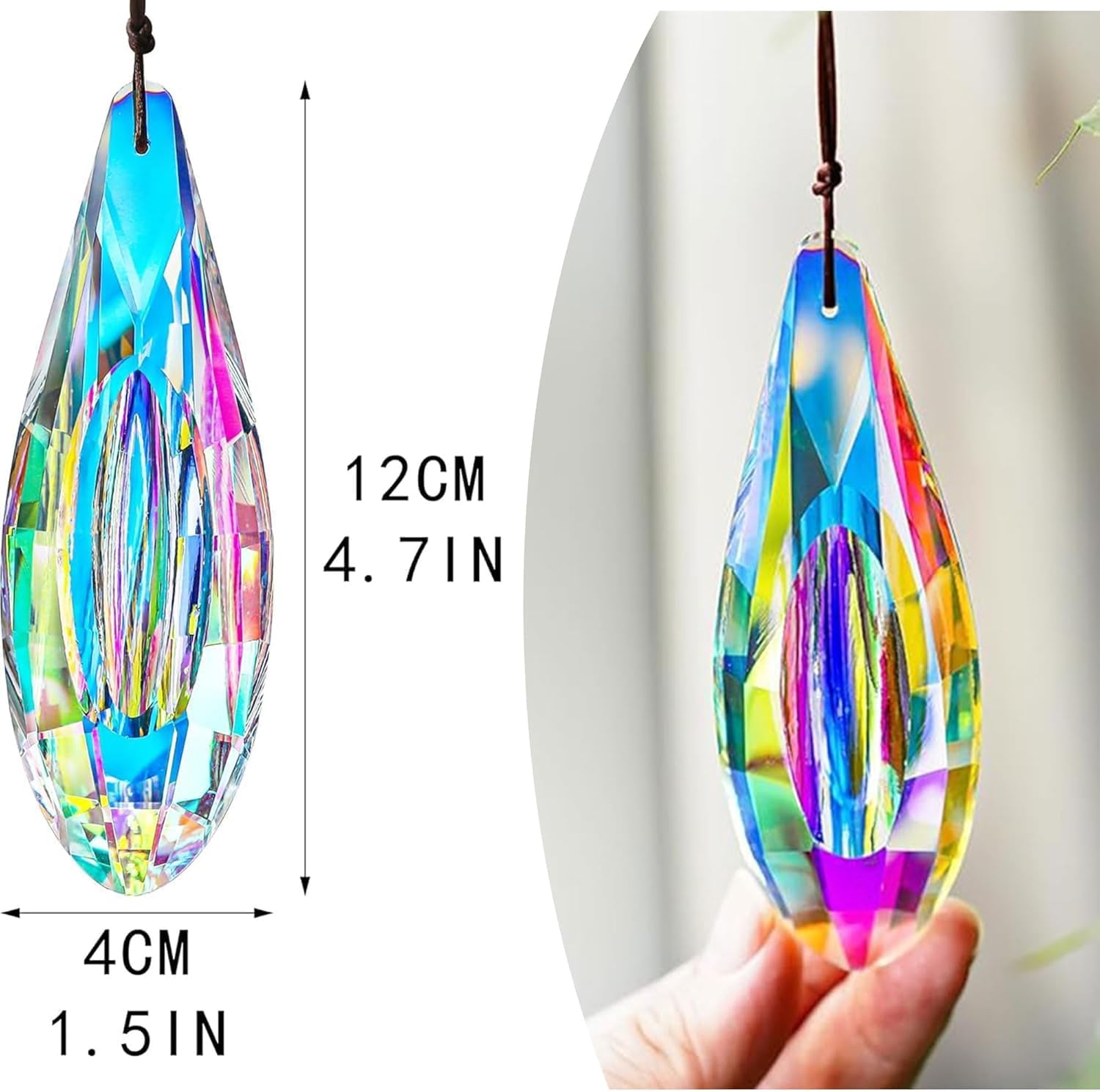 • Package Included: You will get 2pcs of 5" ab color coating large crystal suncatcher prisms pendant and 2pcs of brown strings & 2pcs hooks & 2pcs square buckles for easy hanging