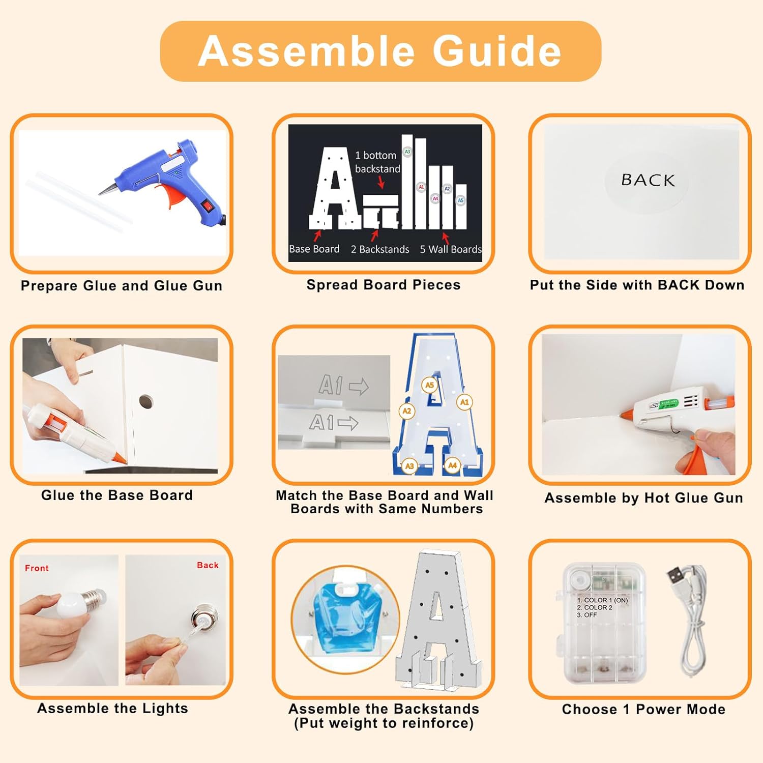 • Easy Assembling Procedure: Pre-cut frame marquee letters are easy to set up: 1) Glue the base board and match the base board and wall boards according to same letter. 2) Glue the base board and wall boards together. 3) Screw the bulbs into the board, connect LED lights and power on. (Noted: Glue gun, glue and batteries are not included) Let the installed marquee letters light up every scene you need!