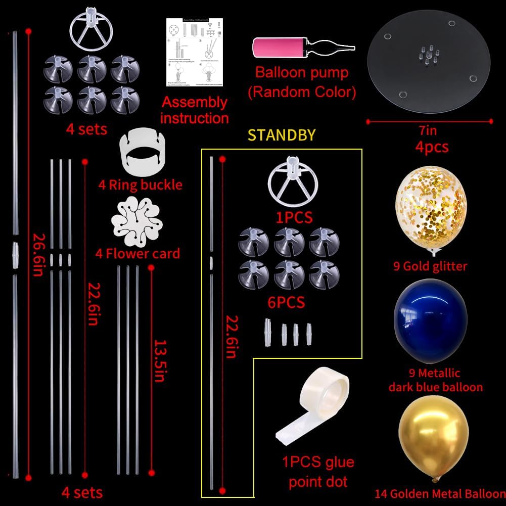 • Package Includes: The balloon arch kit includes 4 reusable balloon centerpiece table decorations and 12inch 32 pcs Latex Balloons (14 gold balloons,9 navy blue balloons,9 gold confetti balloons),glue point dots,balloon pump,balloon clips,and tie tool.You don’t need to waste money to buy balloons