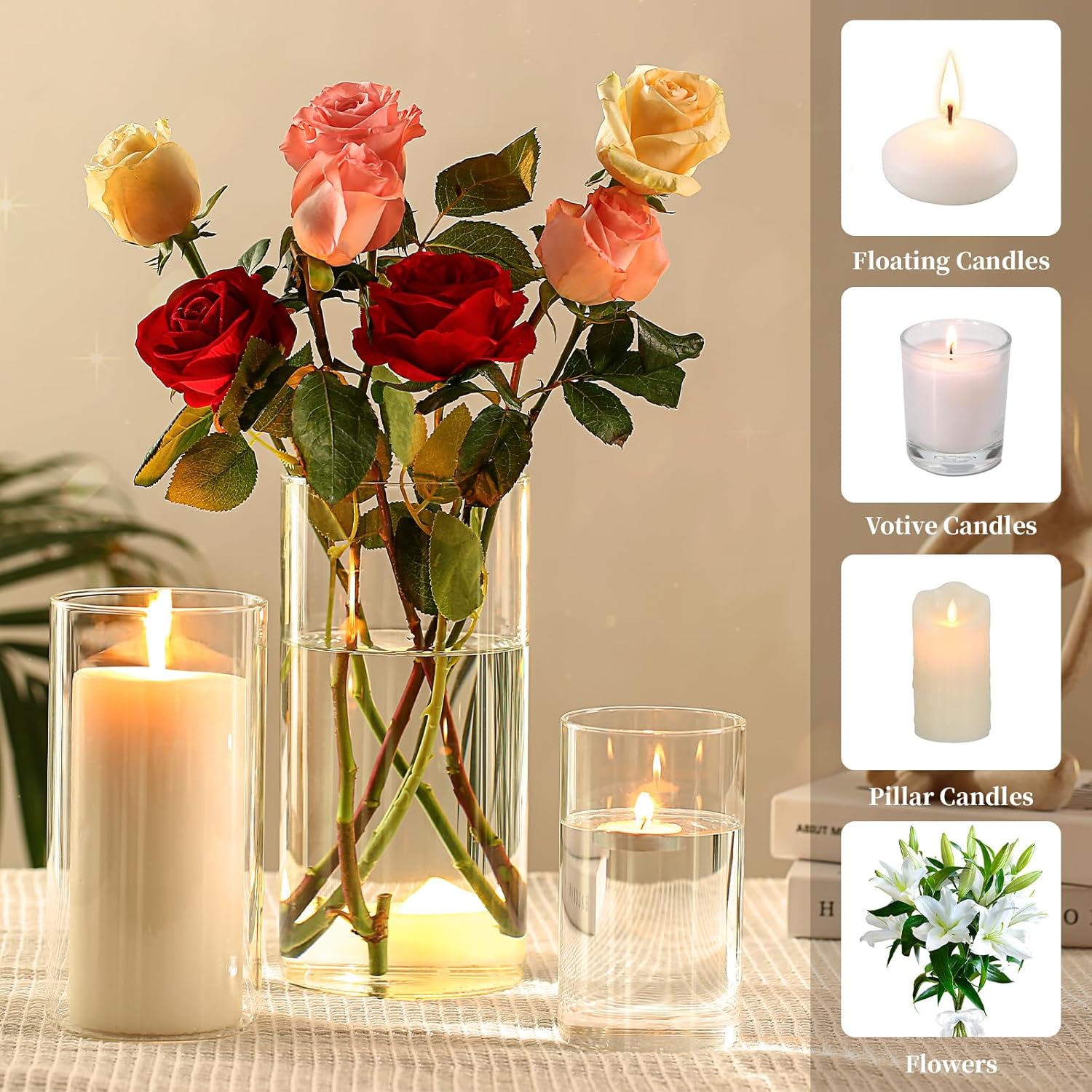 • 3 Different Sizes Candle Holder: The set glass candle holder includes 3 different size¡ªLarge Size: width 4.7'' x height 10'', Medium Size: width 3.9'' x height 7.8'', Small Size: width 3.3'' x height 5.9'', each size 6 pcs, It can be used as a pillar candle holder, floating candle holder, and vase for flowers, which is the ideal choice for modern home decoration