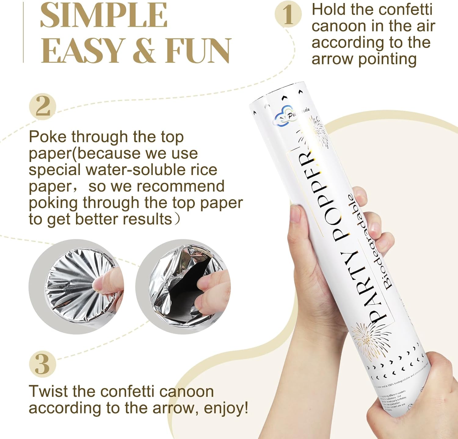 • Biodegradable Lettering: With "biodegradable" lettering printed on each white confetti cannon, every guest who sees and uses these beautiful white confetti poppers will know you've chosen the right way to party