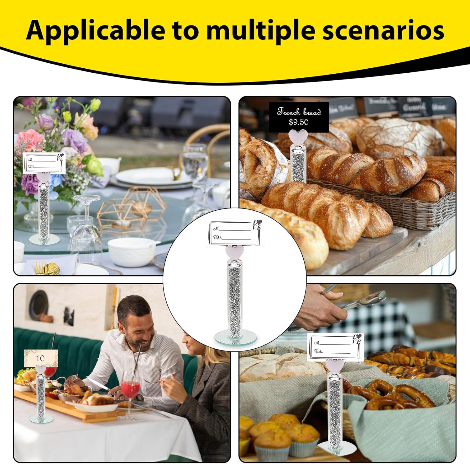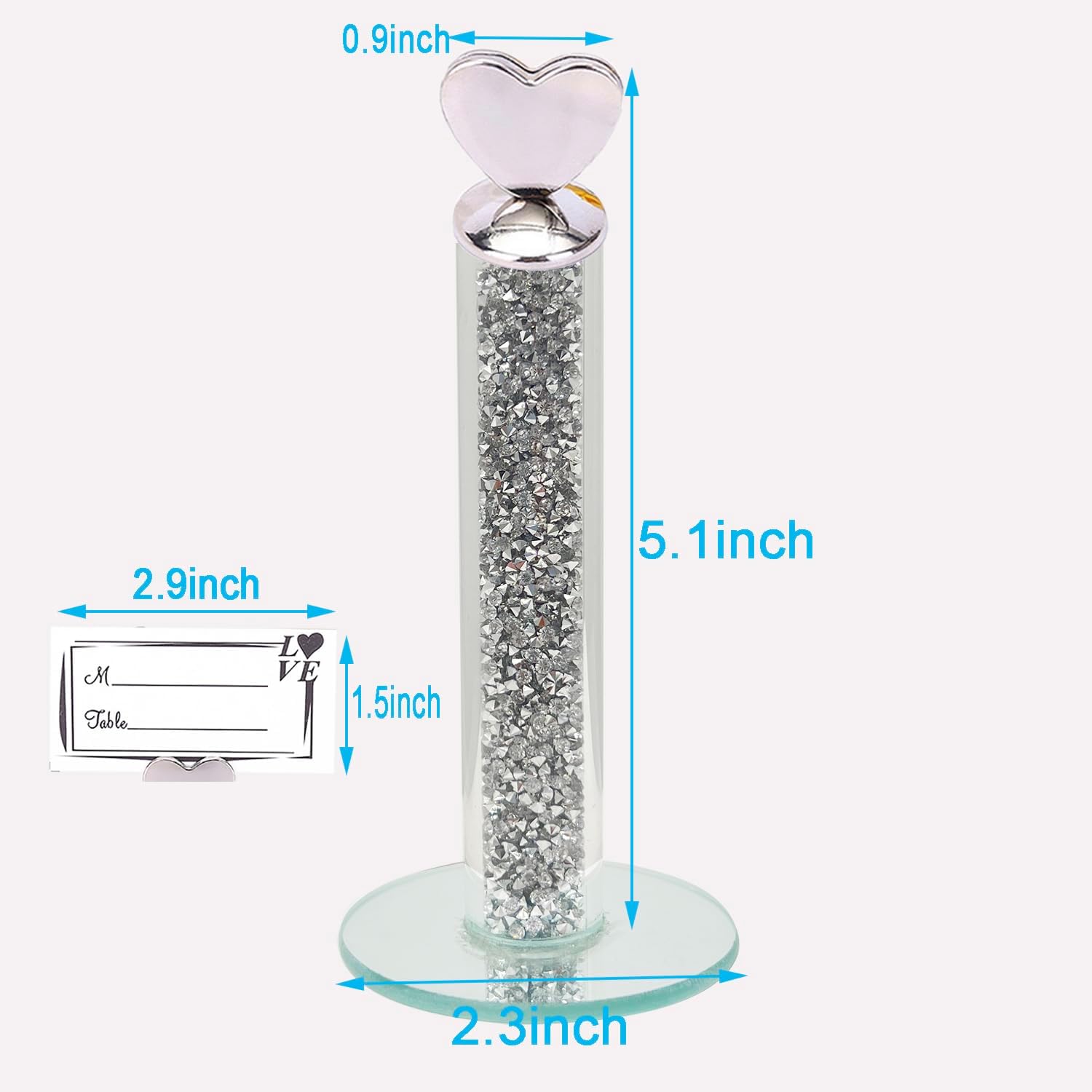 • Proper Size: the heart glass card holder stand is about 5.1 inches, the clip is about 2.3 inches long, appropriate for you to install and see them. The card is about 3 inches and 1.5 inches high when , which can offer you enough place to write table number, guest name, food name, or other personal information