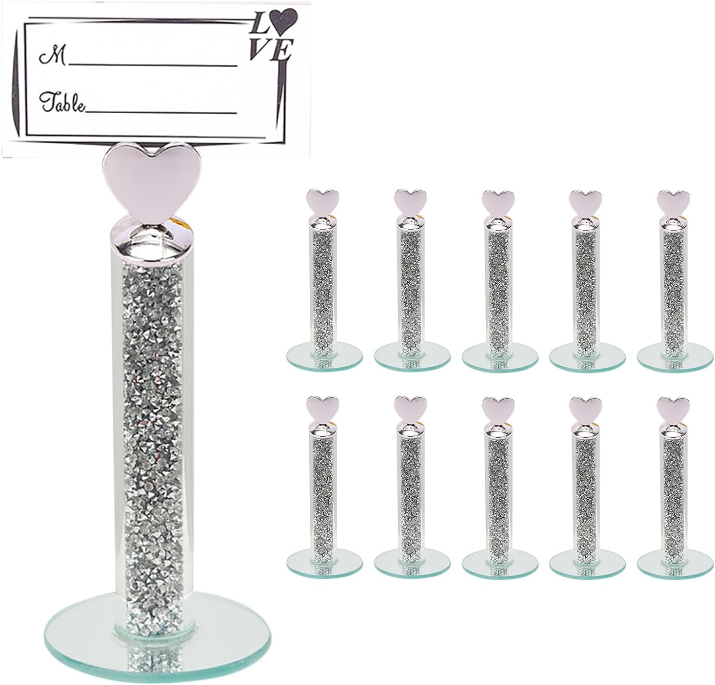 TACIDON 10Pcs Heart Table Number Holders with 10Pcs Table Numbers, Glamorous Crystal Crushed Diamond Place Card Holder, Table Card Holders for Home Wedding Dinner Party Events Decoration (Silver)