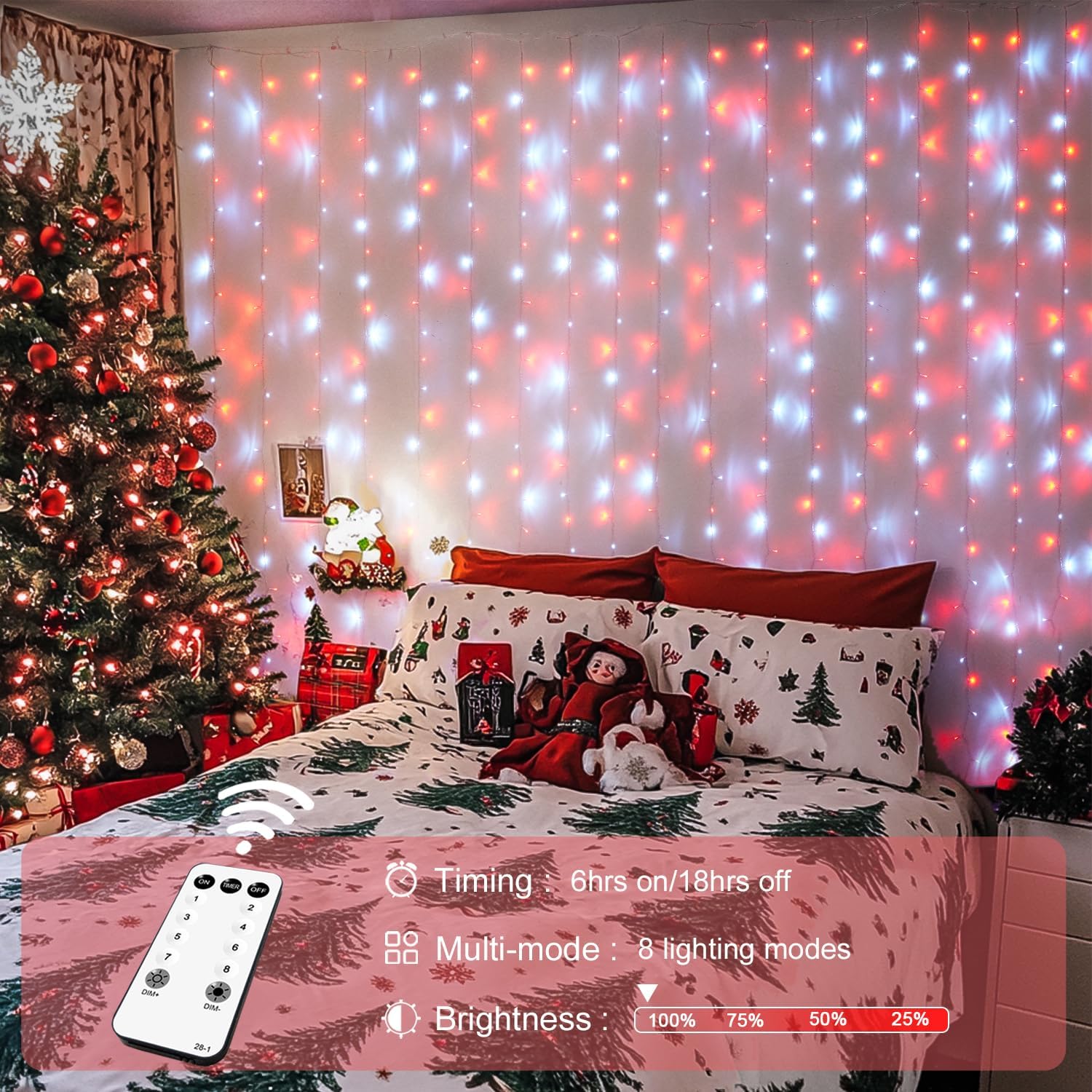 JMEXSUSS 300LED Red and White Christmas Curtain Lights with Remote, 9.8x9.8ft Christmas String Lights Plug in, 8 Modes Twinkle Hanging Fairy Lights for Bedroom Window Wall Porch Indoor Outdoor Decor