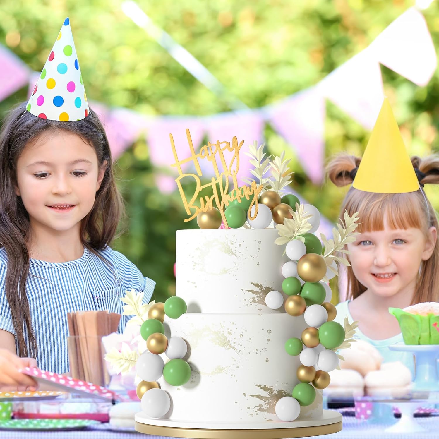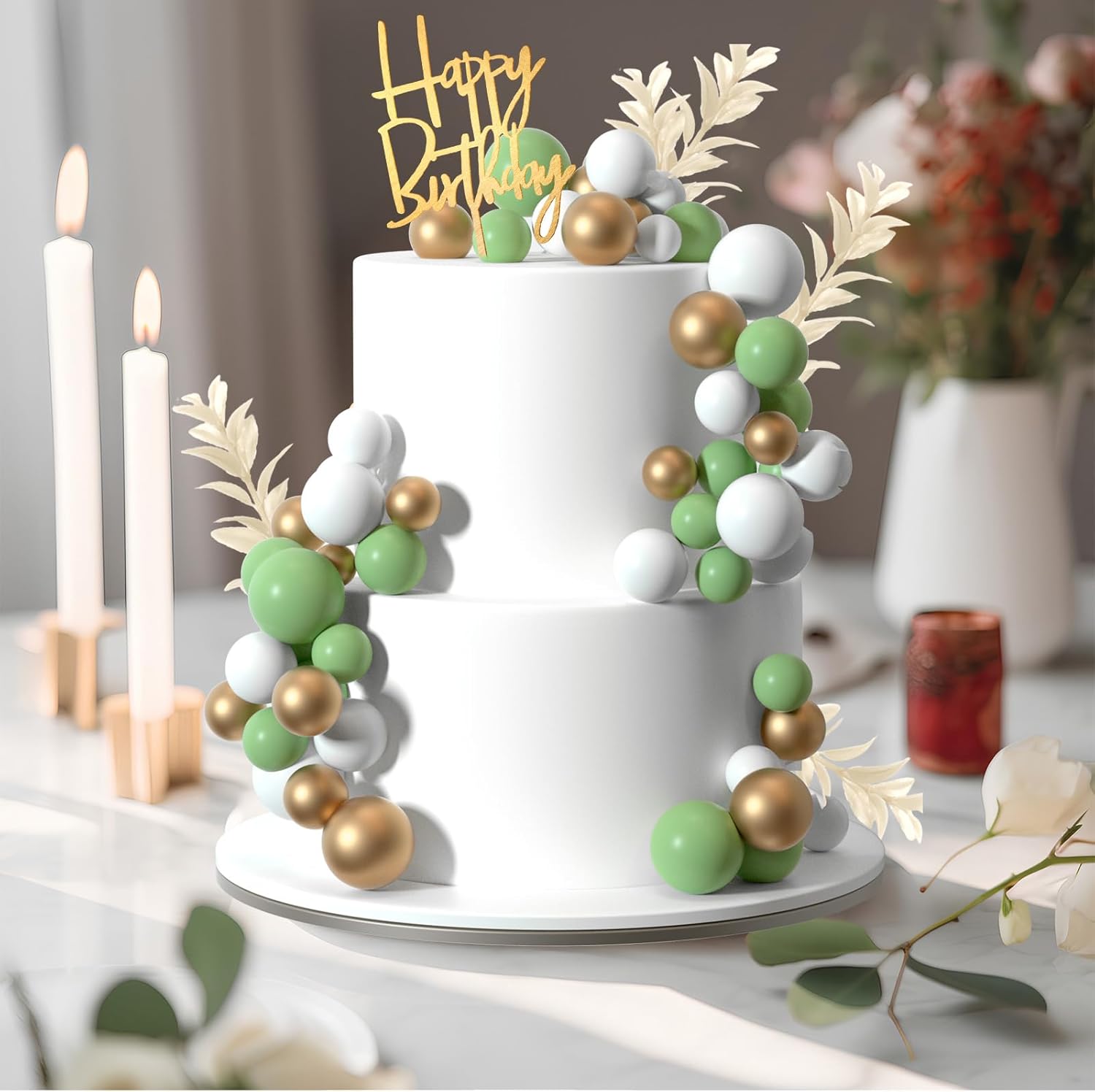 • Package included : 10pcs white grass cake toppers, 1pc happy birthday cake topper, 14pcs green balls, 14pcs gold balls, 14pcs white balls.