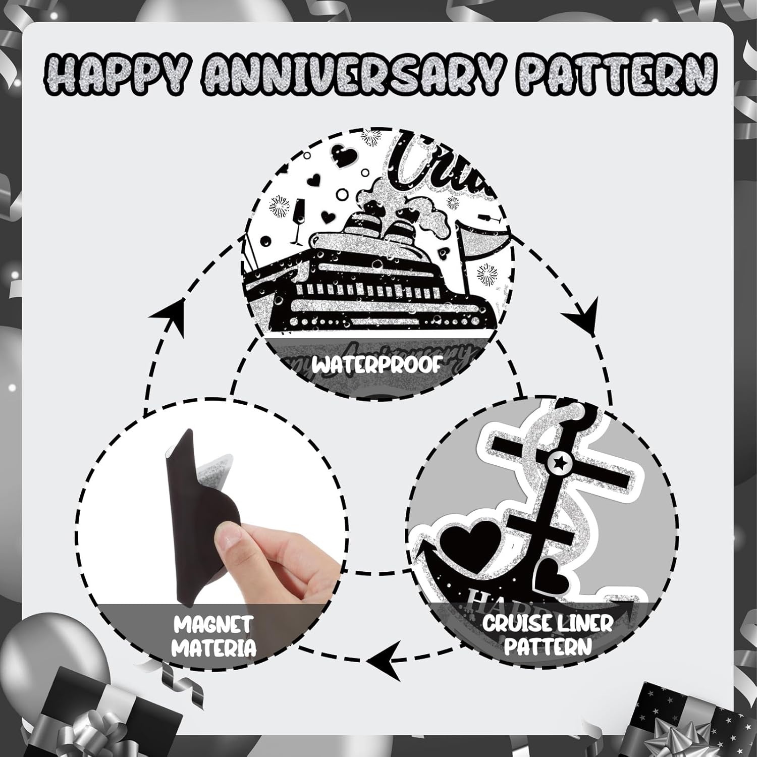 • 🤍Cruise Door Magnets Decorations:You will get 16pcs of Black Silver Happy Anniversary Cruise Door Magnets.These Happy Anniversary Cruise Door Magnets have "Happy Anniversary Cruise" and many shapes.With these beautiful happy anniversary magnets decorations, they further set off a atmosphere of your anniversary party.