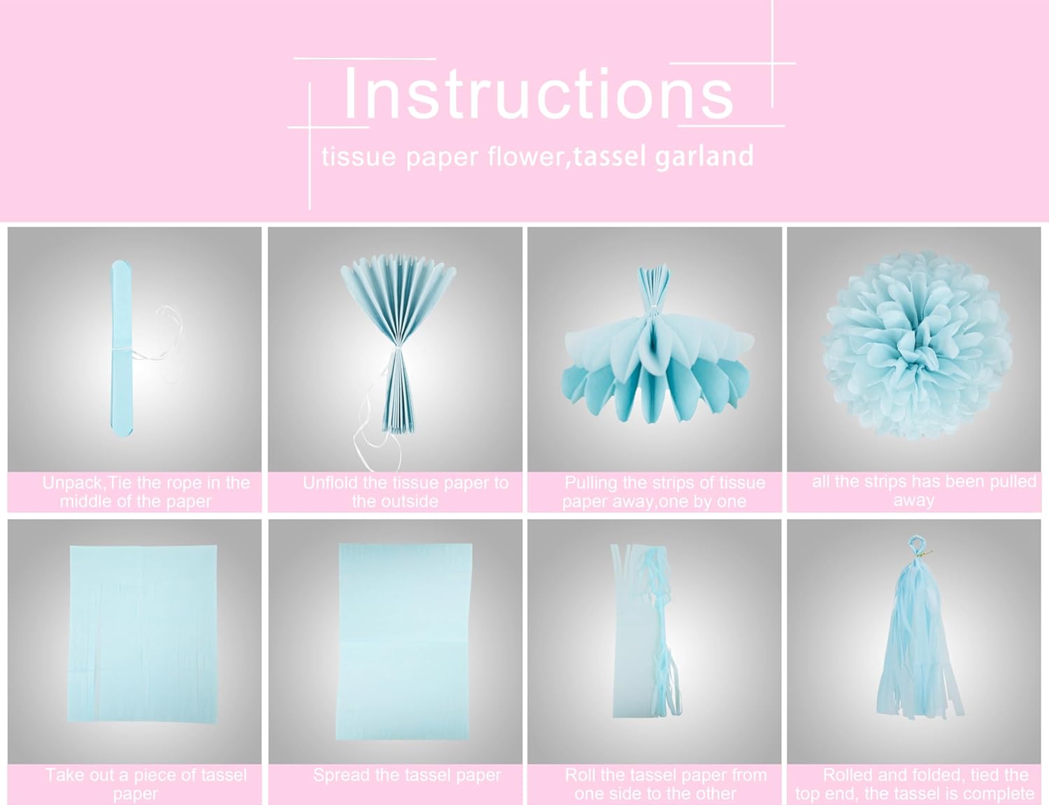 • Included Components : 15pcs tissue paper tassle garland, 1pcs paper banner, 1pcs party streamers, 3 colors: White Blue Pink, 6pcs tissue paper pom poms 15pcs tissue paper tassle garland, 1pcs paper banner, 1pcs party streamers, 3 colors: White Blue Pink, 6pcs tissue paper pom poms