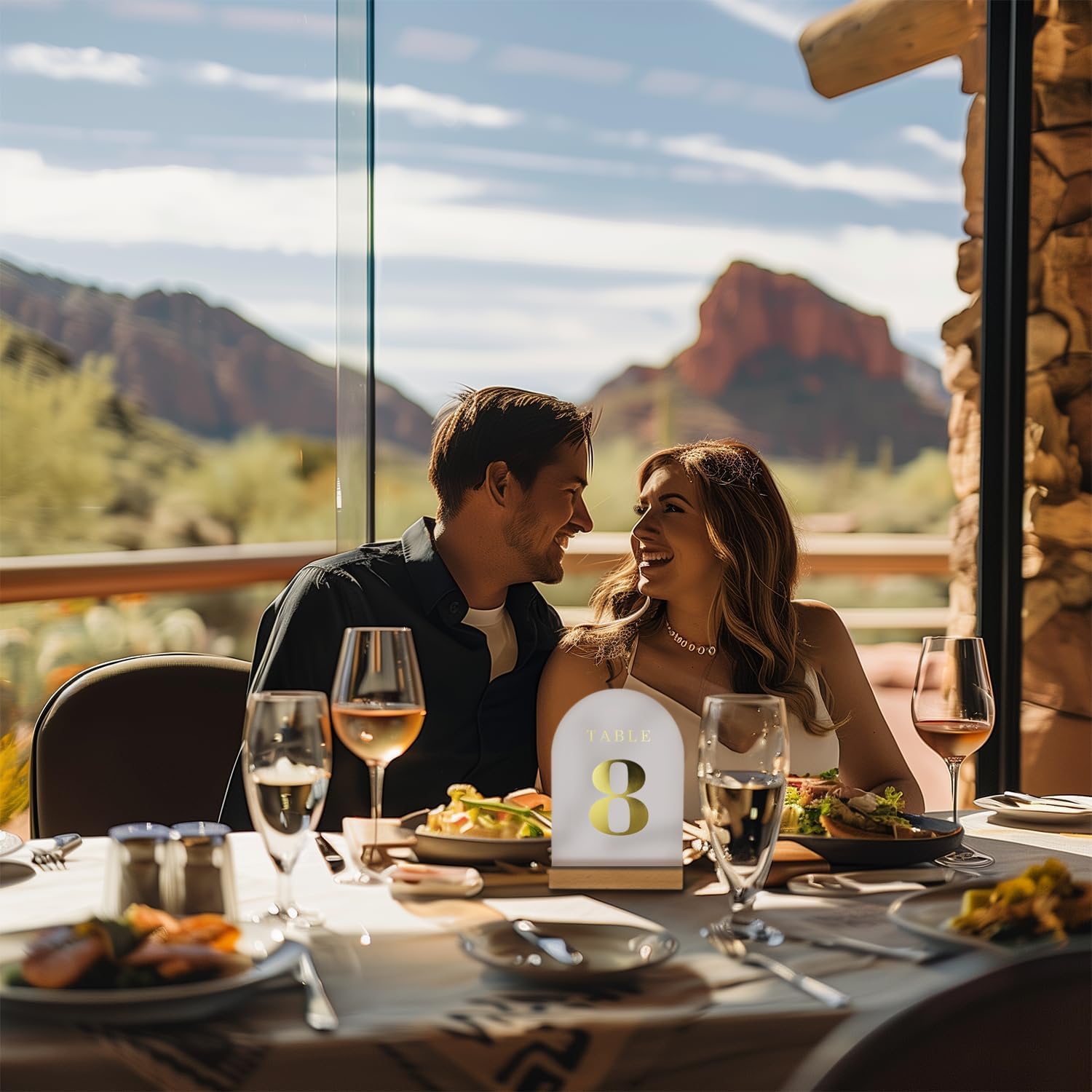 Wedding Table Numbers 1-20, Acrylic Arch Signs with Natural Wood Stands Holders, Rustic Table Decor for Reception & Parties (Frosted Gold)