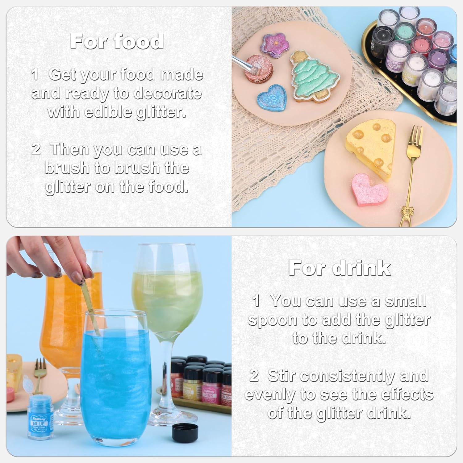 • 【Healthy Food Decoration】: Our edible glitter is made from food-grade ingredients that is vegan-friendly, gluten-free, dairy-free, non-GMO, it will not alter the original taste or texture of beverages and foods. Just as a perfect decoration to add to your creation which make it more charming.