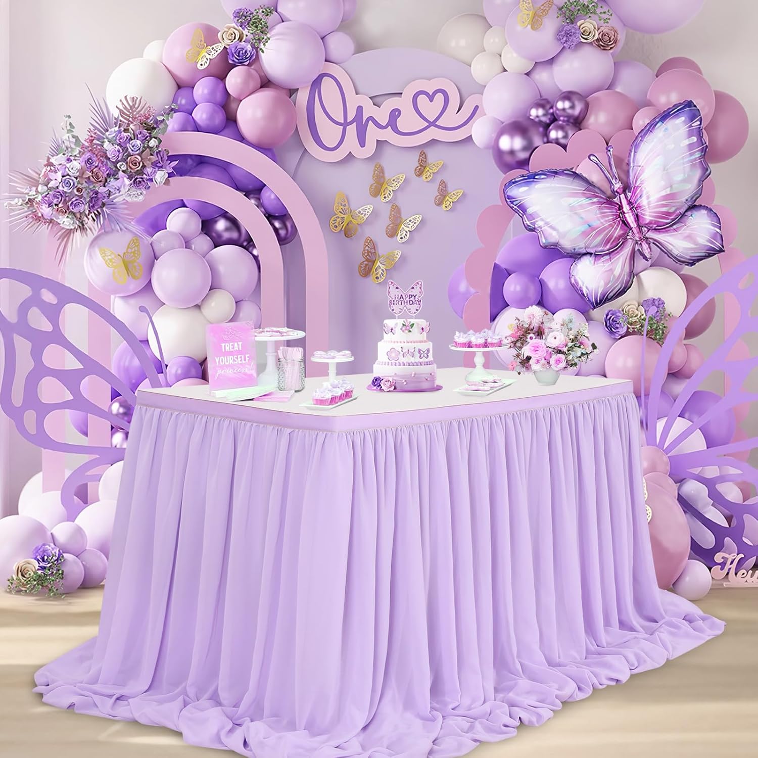 • 💡 Lavender Table Skirt Material: The extra long chiffon table skirt is made of Sheer Chiffon which is wrinkle-free, soft, and with a nice drapery. Table skirt both robust for kids birthday party supplies and elegant if used for wedding decoration.