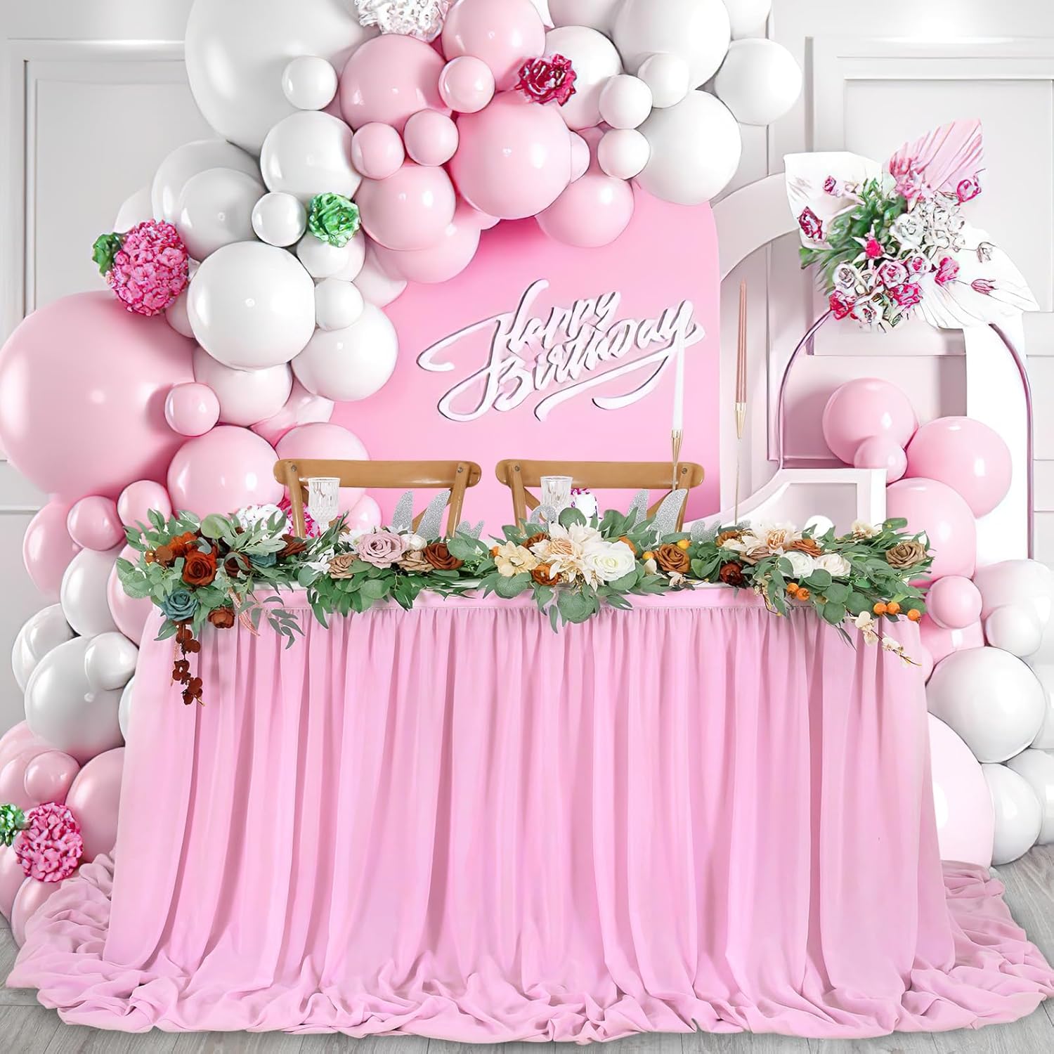 • 💡 Pink Table Skirt Material: The extra long chiffon table skirt is made of Sheer Chiffon which is wrinkle-free, soft, and with a nice drapery. Table skirt both robust for kids birthday party supplies and elegant if used for wedding decoration.