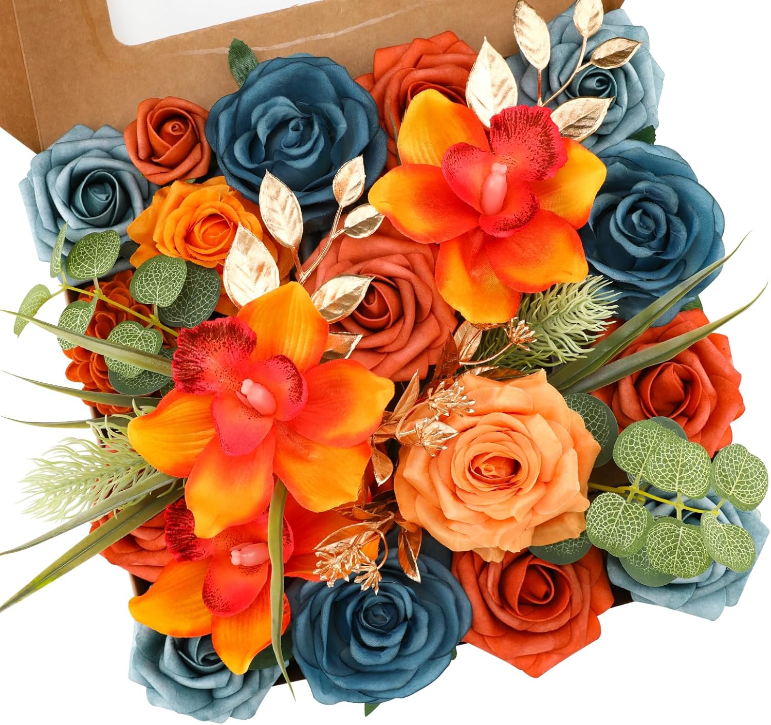 • ♔ORANGE ARTIFICIAL FLOWERS COMBO-Floweroyal faux flower set contains roses, eucalyptus, wild flowers and other accessories. All comes in a very cute box, easy giftable item.