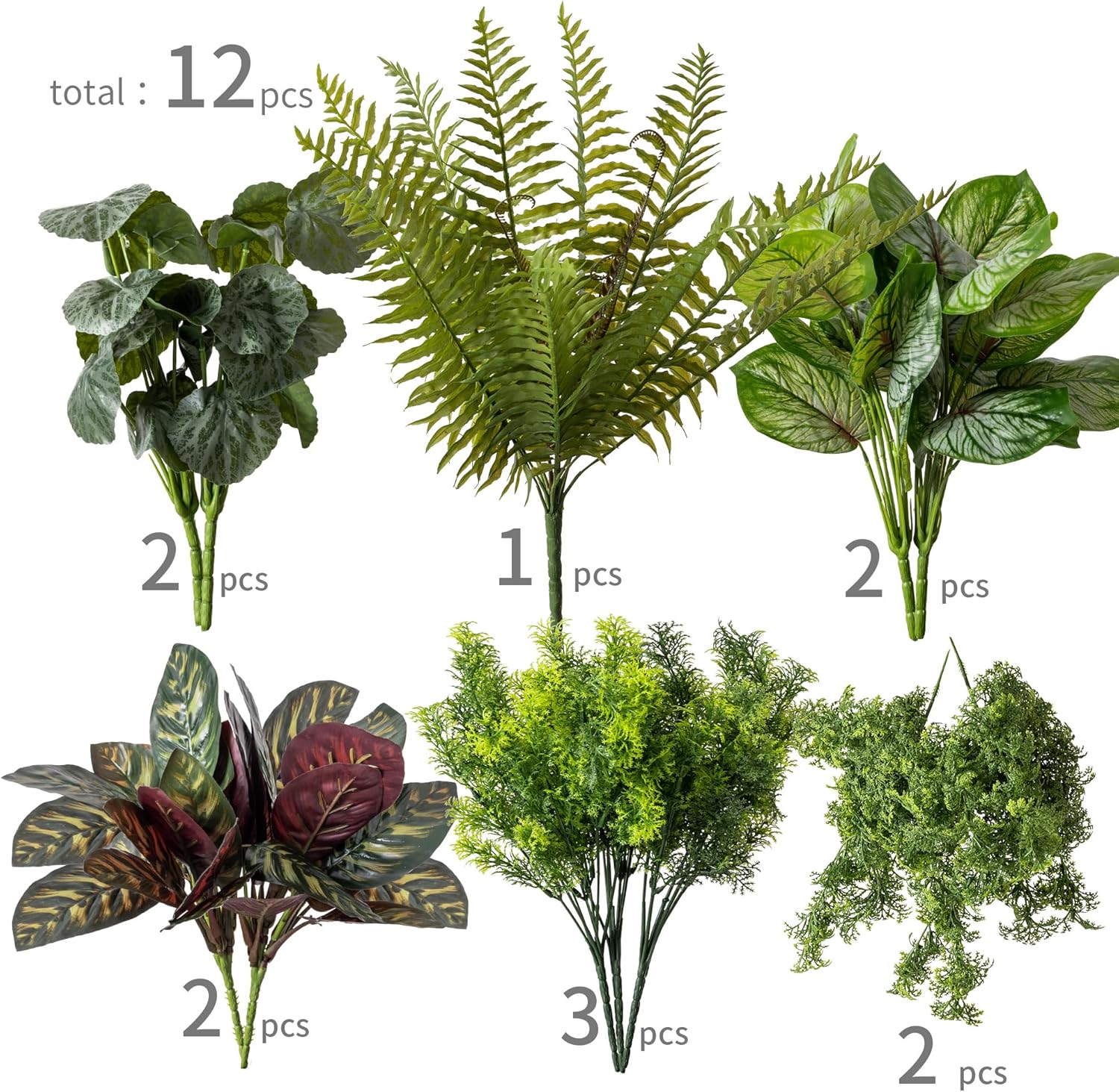 • 【Cost-effective Combination】:Each package contains 6 different kinds of artificial greeneries, which totally has 12 pcs. You can combine or divide them any way you like to create a vibrant corner and add a fresh looking to you house.