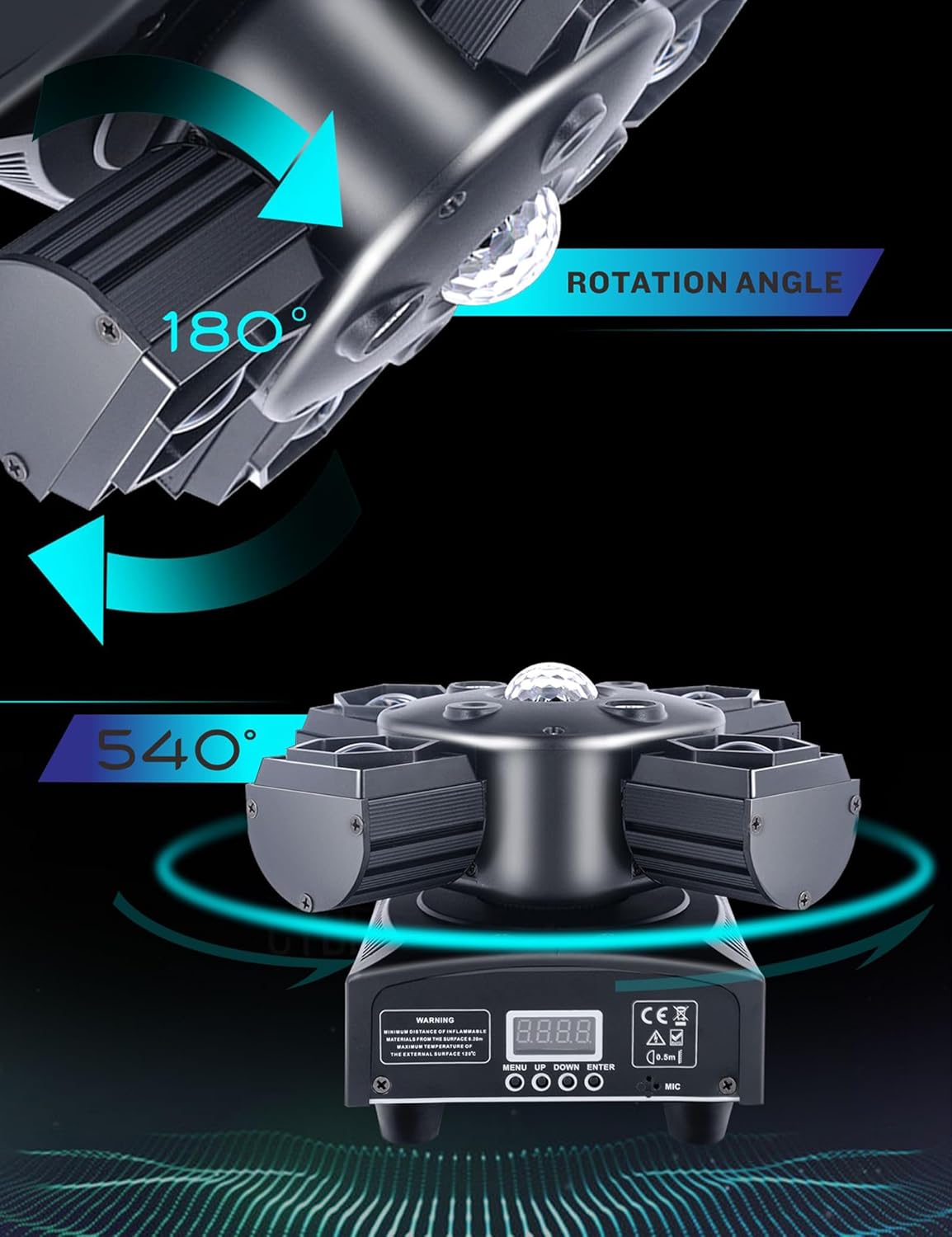 • Advanced Lighting Features: Equipped with four 15W lamp beads, one red laser at 5mW, one green laser at 5mW, and two 5W golden lights, this professional dj light offers a vibrant and dynamic lighting experience perfect for raves, parties, and discotheques.