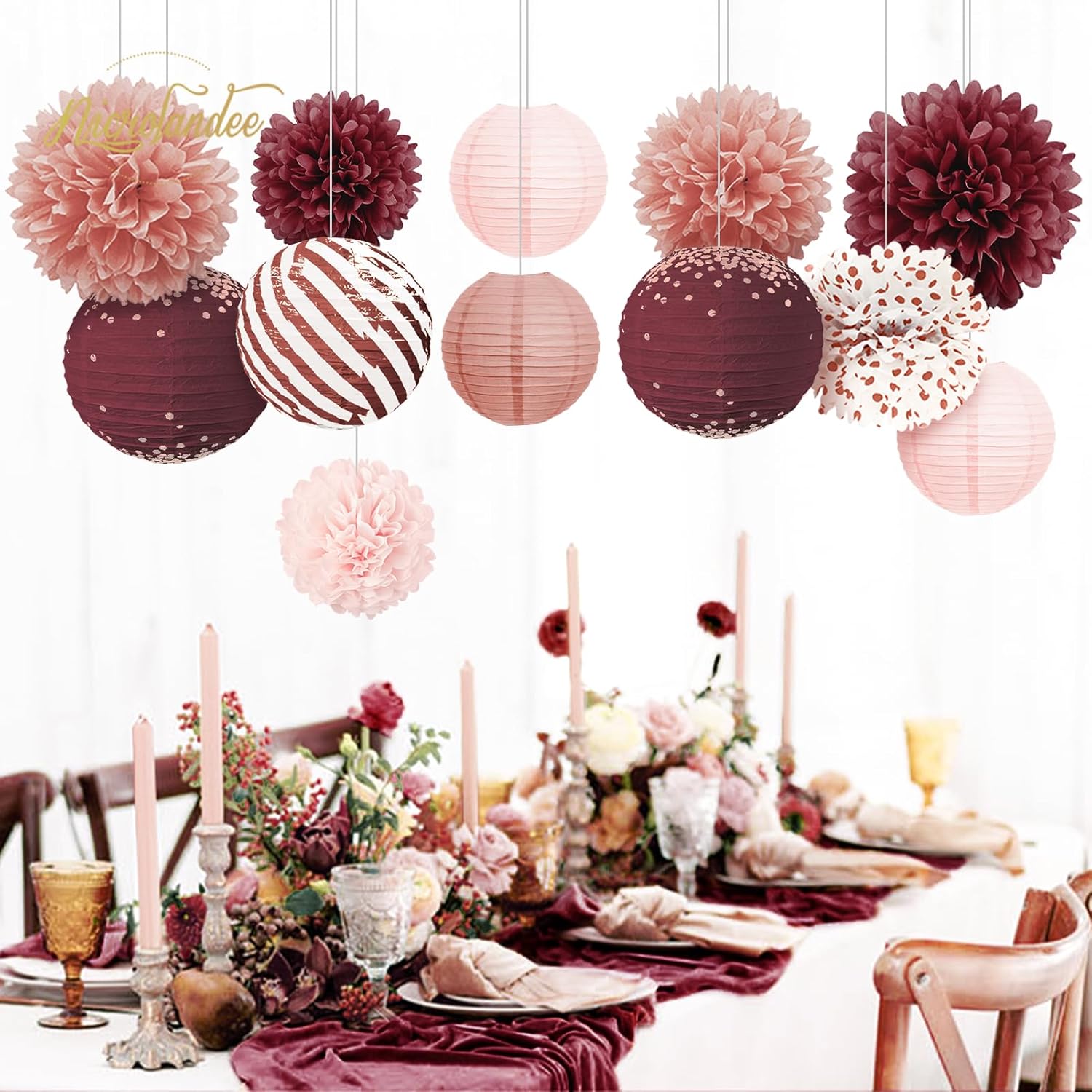 • Perfect for Any Celebration – This tissue pom poms and paper lanterns combo adds elegance to wedding party decorations, birthday party setups, retirement party backdrops, baby showers, and more. The rich burgundy, blush pink, and rose gold hues create a warm, festive atmosphere