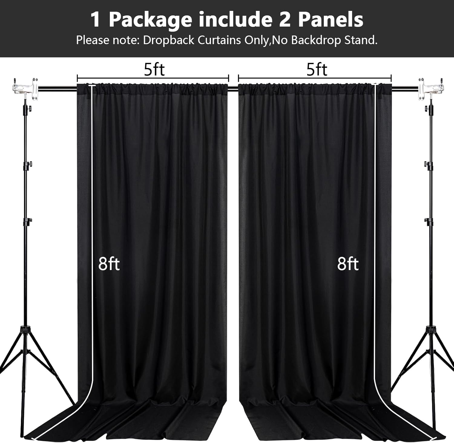 • DIMENSIONS: Each order is for 2 (two) polyester curtains. Each curtain measures 5 feet wide x 8 feet high. Entire backdrop measures 10 feet wide x 8 feet high.Each curtain panel comes with 4 inch rod pocket on top, fit up to any standard rods. (Please note: Dropback Curtains Only,No Backdrop Stand.)