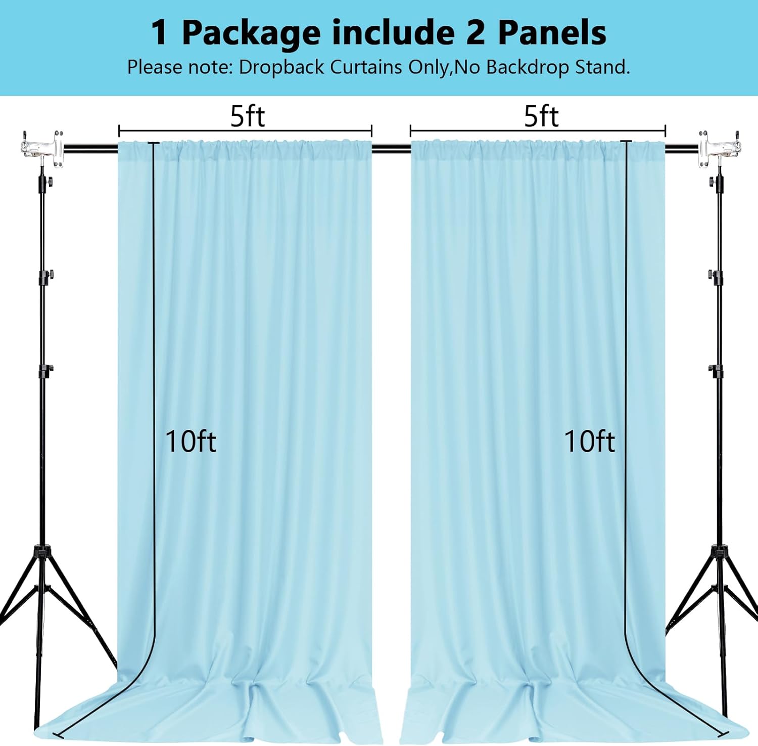• DIMENSIONS: Each order is for 2 (two) polyester curtains. Each curtain measures 5 feet wide x 10 feet high. Entire backdrop measures 10 feet wide x 10 feet high.Each curtain panel comes with 4 inch rod pocket on top, fit up to any standard rods. (Please note: Dropback Curtains Only,No Backdrop Stand.)