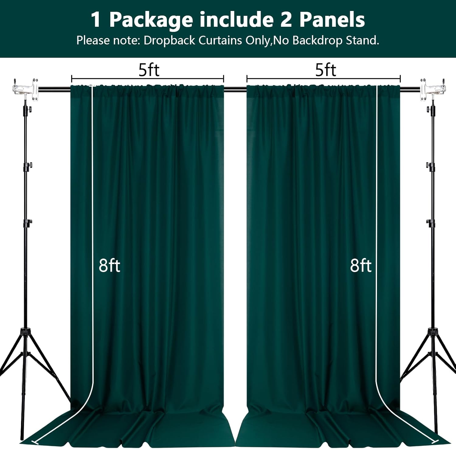 • DIMENSIONS: Each order is for 2 (two) polyester curtains. Each curtain measures 5 feet wide x 8 feet high. Entire backdrop measures 10 feet wide x 8 feet high.Each curtain panel comes with 4 inch rod pocket on top, fit up to any standard rods. (Please note: Dropback Curtains Only,No Backdrop Stand.)
