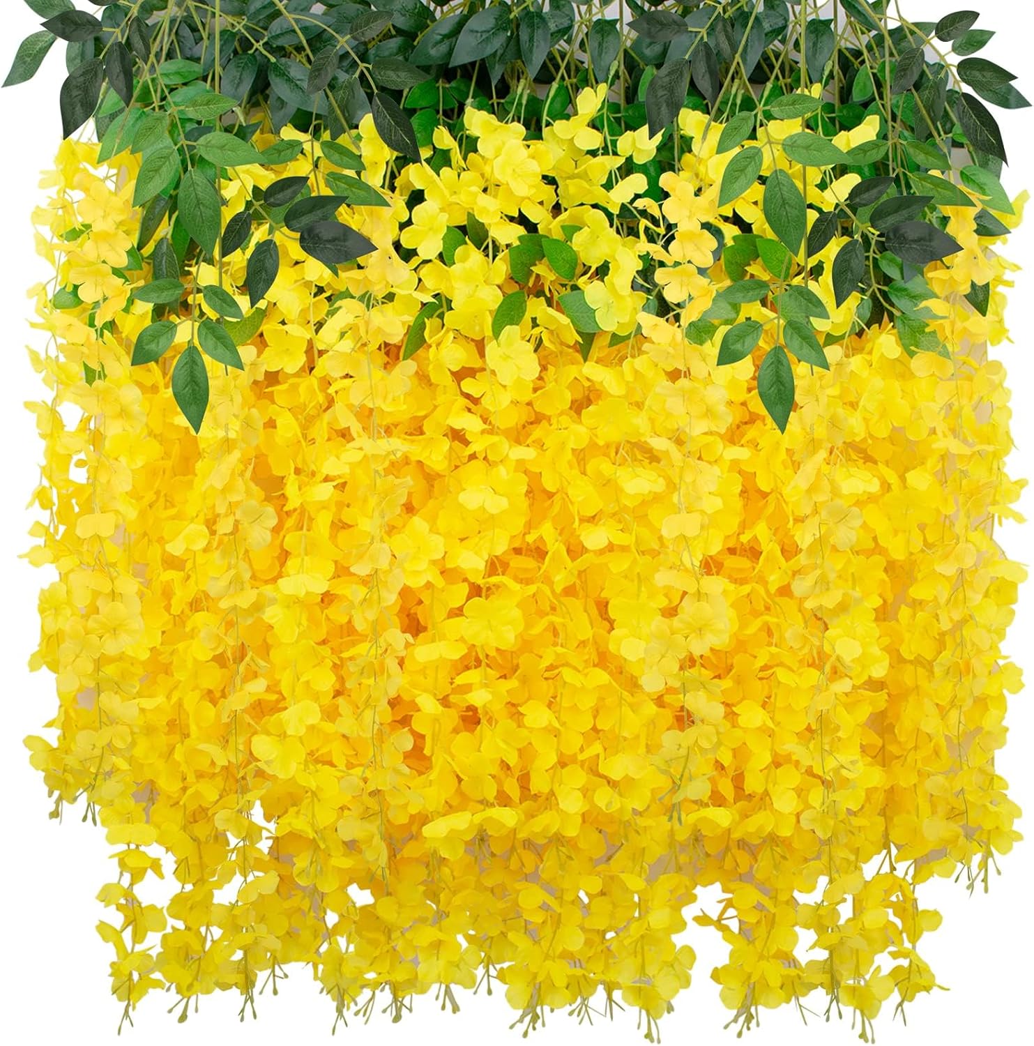 • 🌼Product Details - 12 pack artificial yellow hanging flowers, each wisteria flower vine is approximately 43.2"/3.6 ft in length, each wisteria has 3 branched flower strings, each string is 23.62" long with abundant flowers, looking full and beautiful.