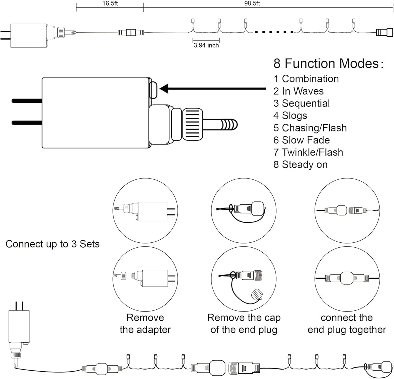 • 8 Lighting Functions with Memory Function: Our Christmas string lights have 8 lighting modes- combination, in waves, sequential, slogs, chasing/flash, slow fade, twinkle/flash, and steady on. Just pressing the round button on the transformer to change the lighting modes. Comes with memory function, will remember last setting automatically after cutting off the power, no need to reset again