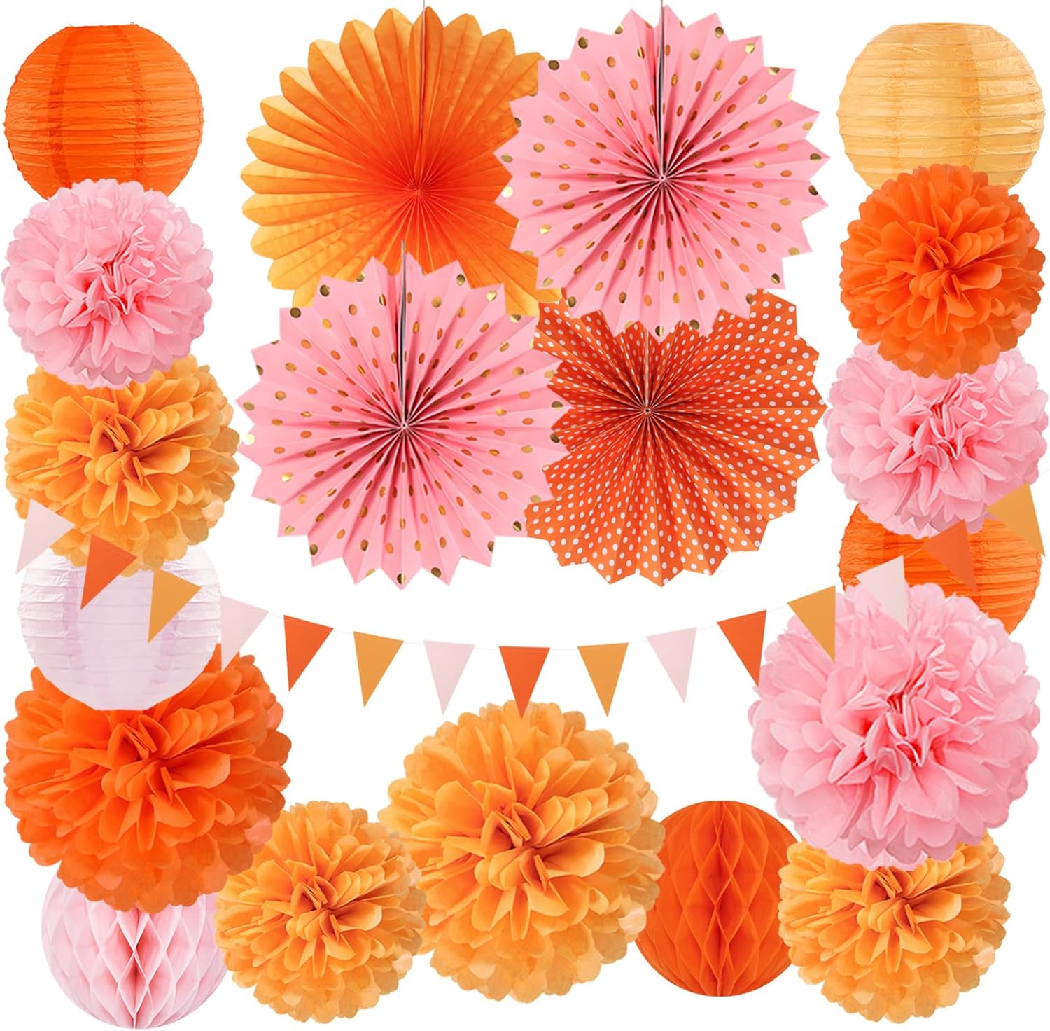 Pink-Orange Groovy Party-Decorations - 20pcs Fall Autumn Thanksgiving Harvest Paper Streamers Lanterns Fans,Tissue Pom Poms,Honeycomb Balls,Bunting,Birthday Baby Bridal Shower Wedding Decor Burgleda