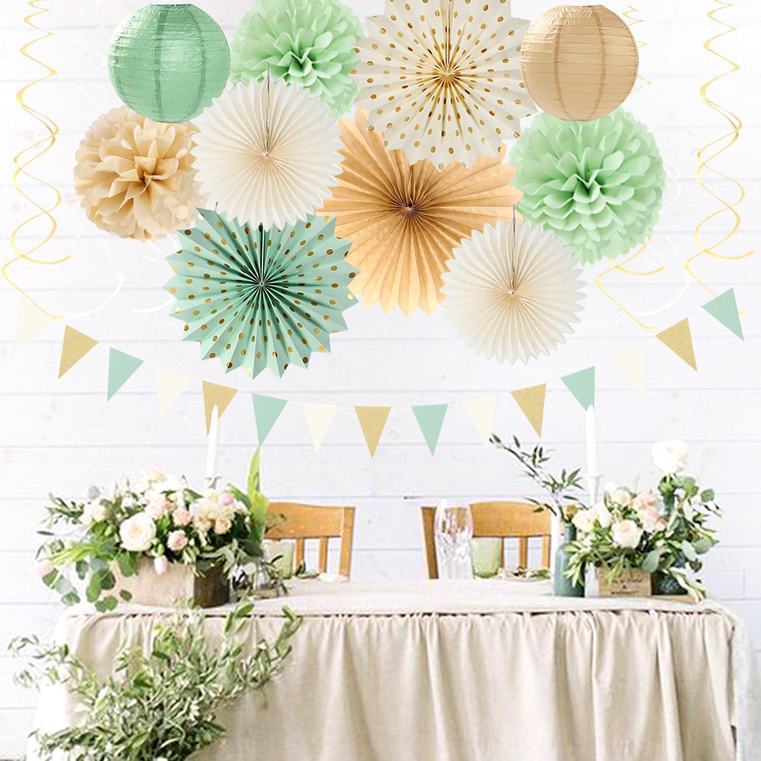 Sage-Green Beige Champagne-Gold Party-Decorations - 33pcs Neutral Women Birthday Baby Shower Banner,Streamers Tassel Garland,Tissue Pom Poms,Paper Lantern Fans,Boho Wedding Bachelorette Decor Hugtmr