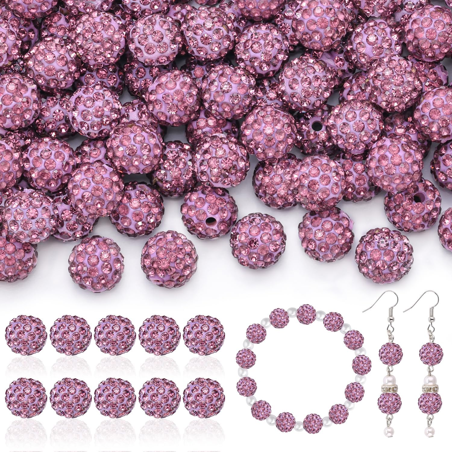 105pcs 10mm Rhinestone Beads for Jewelry Making, Light Purple Shiny Round Disco Beads Bulk, Sparkle Crystal Clay Christmas for Bracelet Baseball Necklace Earring Crafting and DIY