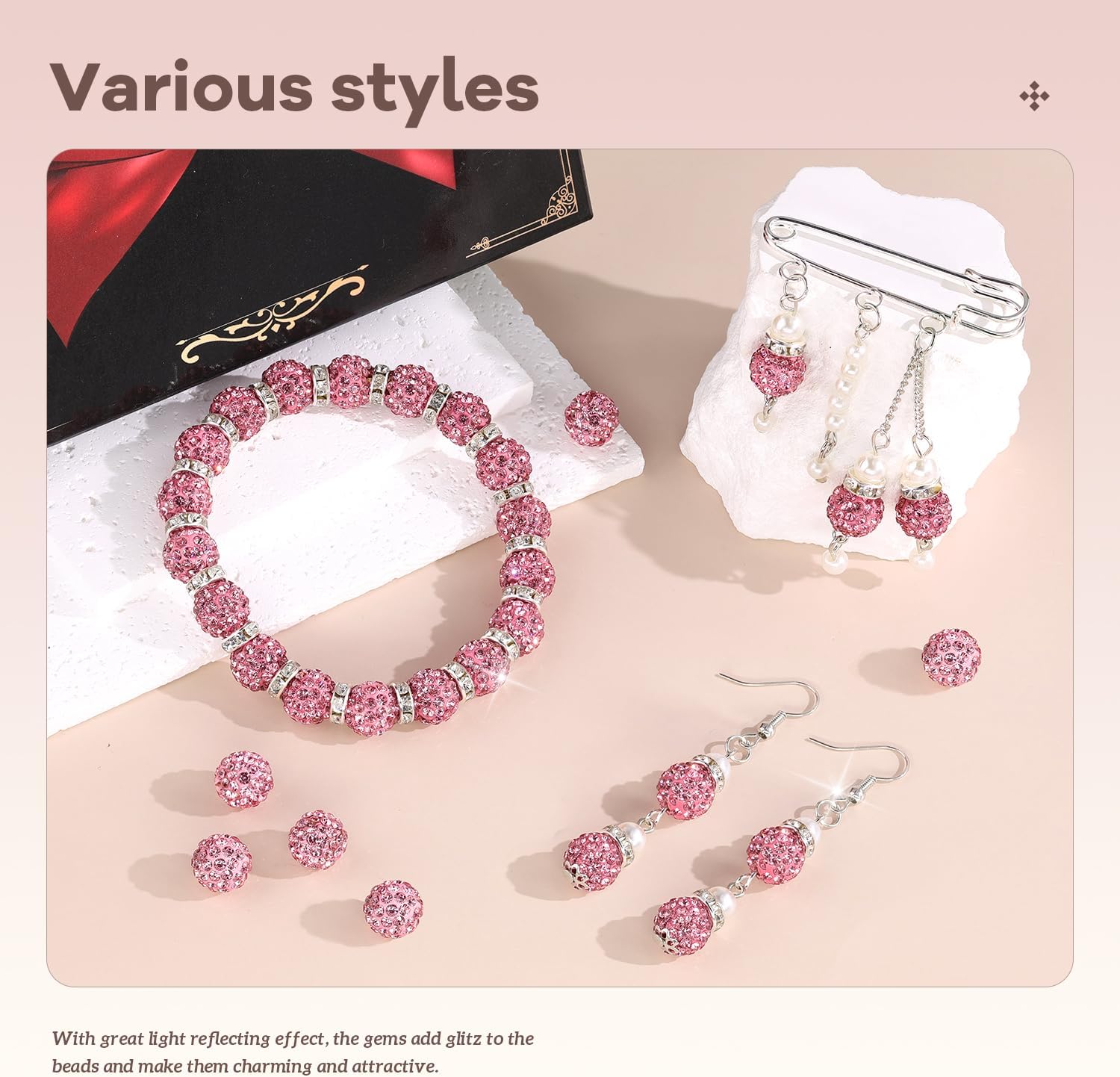 • BLING EFFECT -- Our rhinestone beads are made of polymer clay, embedded with superior quality glass rhinestones. We do quality control management to ensure the high quality of the bling beads. Rhinestones cover the entire surface and are not easy to fall off, shining like a diamond. With great light reflecting effect, the gems add glitz to the beads and make them charming and eye-catching. Wearing ornaments made from these beads, you will be the center of attention.