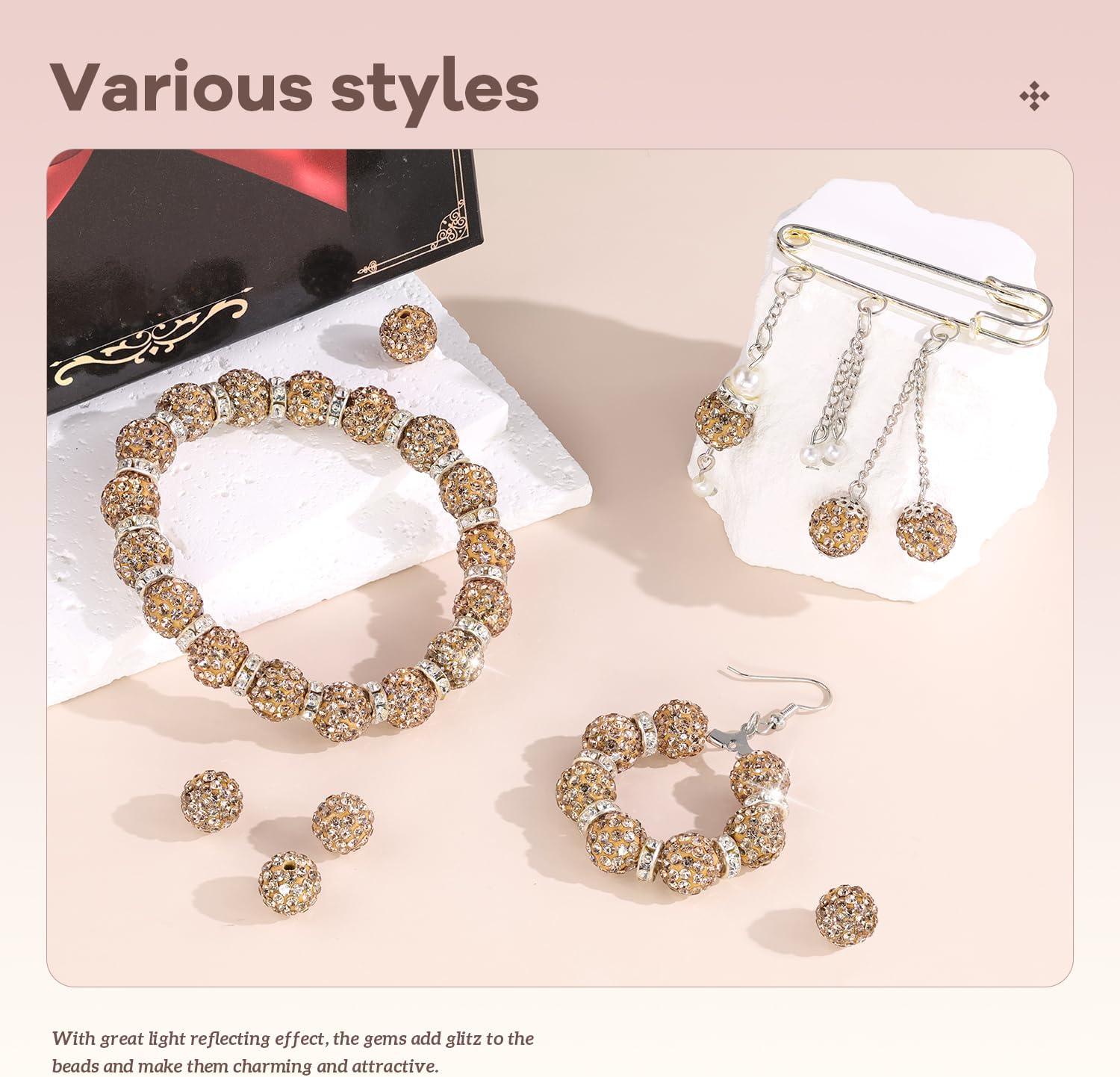 105pcs 10mm Rhinestone Beads for Jewelry Making, Light Brown Shiny Round Disco Ball Beads Bulk, Sparkle Crystal Clay Christmas for Bracelet Baseball Necklace Earring Crafting and DIY