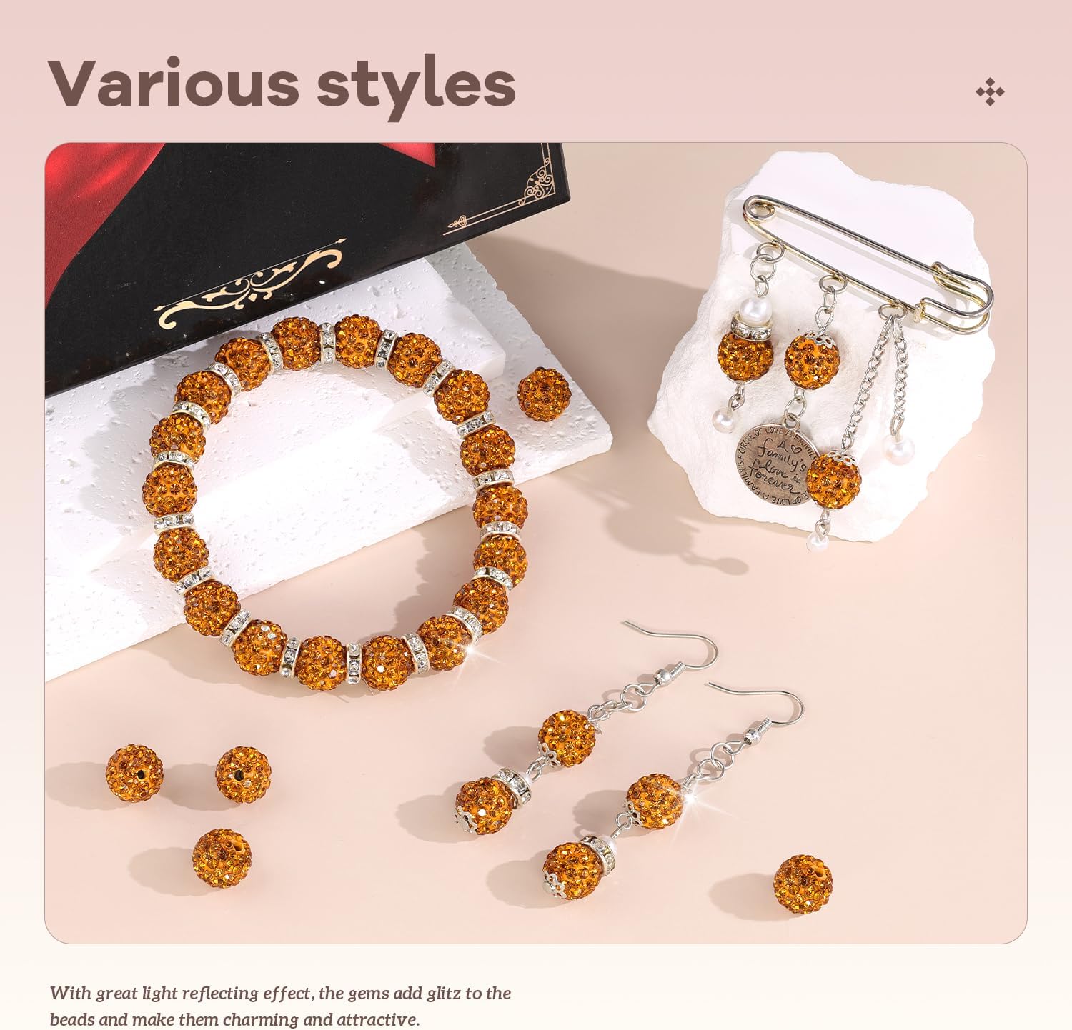 • BLING EFFECT -- Our rhinestone beads are made of polymer clay, embedded with superior quality glass rhinestones. We do quality control management to ensure the high quality of the bling beads. Rhinestones cover the entire surface and are not easy to fall off, shining like a diamond. With great light reflecting effect, the gems add glitz to the beads and make them charming and eye-catching. Wearing ornaments made from these beads, you will be the center of attention.